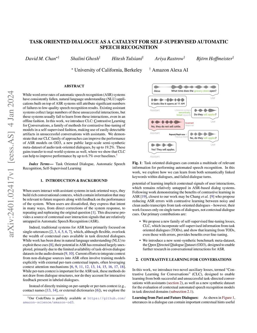 While word error rates of automatic speech recognition (ASR) systems have consistently fallen, natural language understanding (NLU) applications built on top of ASR systems still attribute significant numbers of failures to low-quality speech recognition results. Existing assistant systems collect large numbers of these unsuccessful interactions, but these systems usually fail to learn from these interactions, even in an offline fashion. In this work, we introduce CLC: Contrastive Learning for Conversations, a family of methods for contrastive fine-tuning of models in a self-supervised fashion, making use of easily detectable artifacts in unsuccessful conversations with assistants. We demonstrate that our CLC family of approaches can improve the performance of ASR models on OD3, a new public large-scale semi-synthetic meta-dataset of audio task-oriented dialogues, by up to 19.2%. These gains transfer to real-world systems as well, where we show that CLC can help to improve performance by up to 6.7% over baselines. We make OD3 publicly available at https://github.com/amazon-science/amazon-od3 .