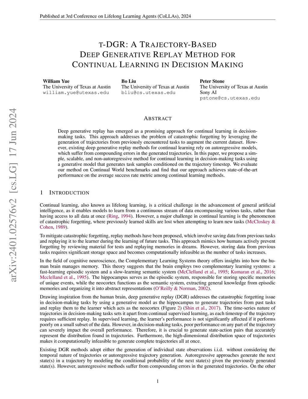 t-DGR: A Trajectory-Based Deep Generative Replay Method for Continual