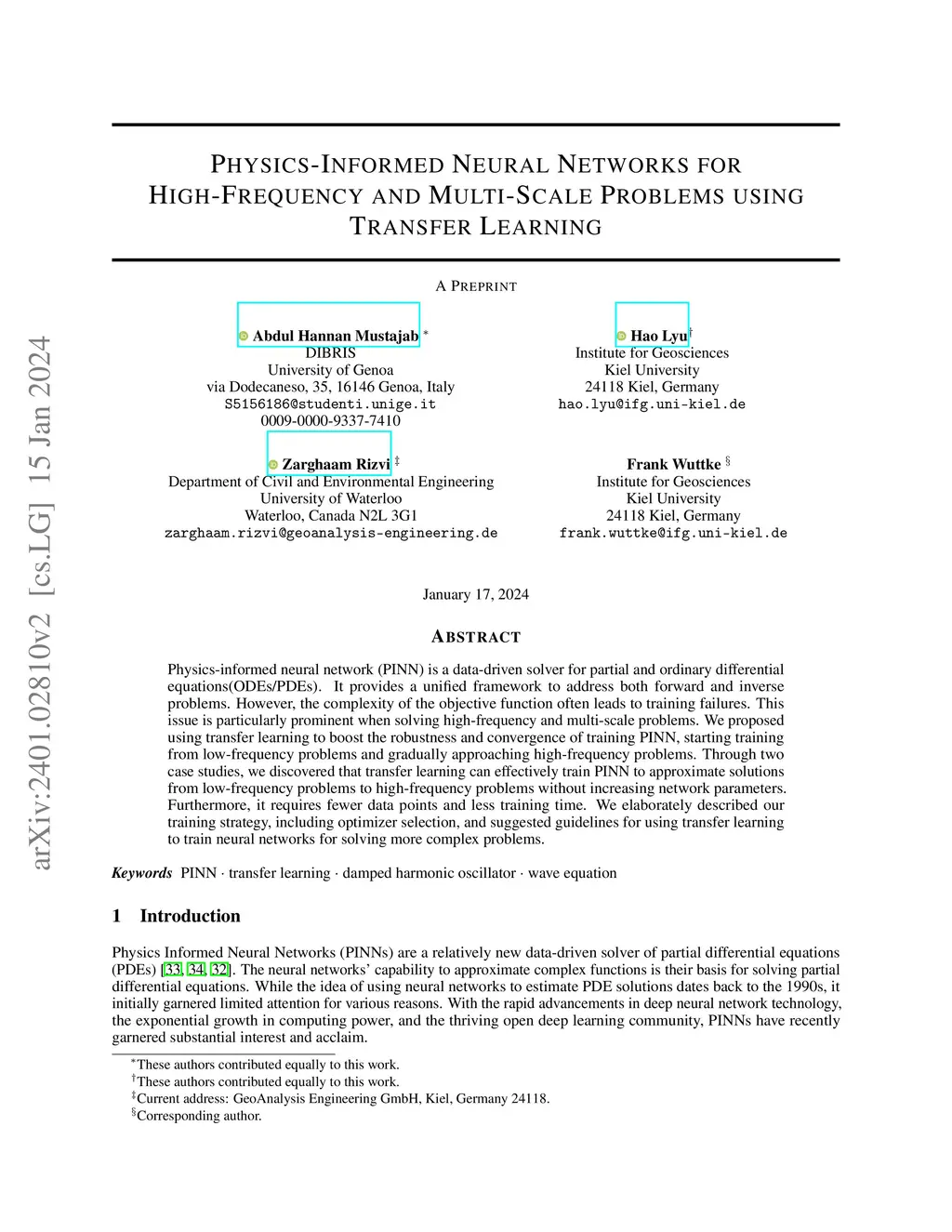 Physics-informed neural network (PINN) is a data-driven solver for partial and ordinary differential equations(ODEs/PDEs). It provides a unified framework to address both forward and inverse problems. However, the complexity of the objective function often leads to training failures. This issue is particularly prominent when solving high-frequency and multi-scale problems. We proposed using transfer learning to boost the robustness and convergence of training PINN, starting training from low-frequency problems and gradually approaching high-frequency problems. Through two case studies, we discovered that transfer learning can effectively train PINN to approximate solutions from low-frequency problems to high-frequency problems without increasing network parameters. Furthermore, it requires fewer data points and less training time. We elaborately described our training strategy, including optimizer selection, and suggested guidelines for using transfer learning to train neural networks for solving more complex problems.