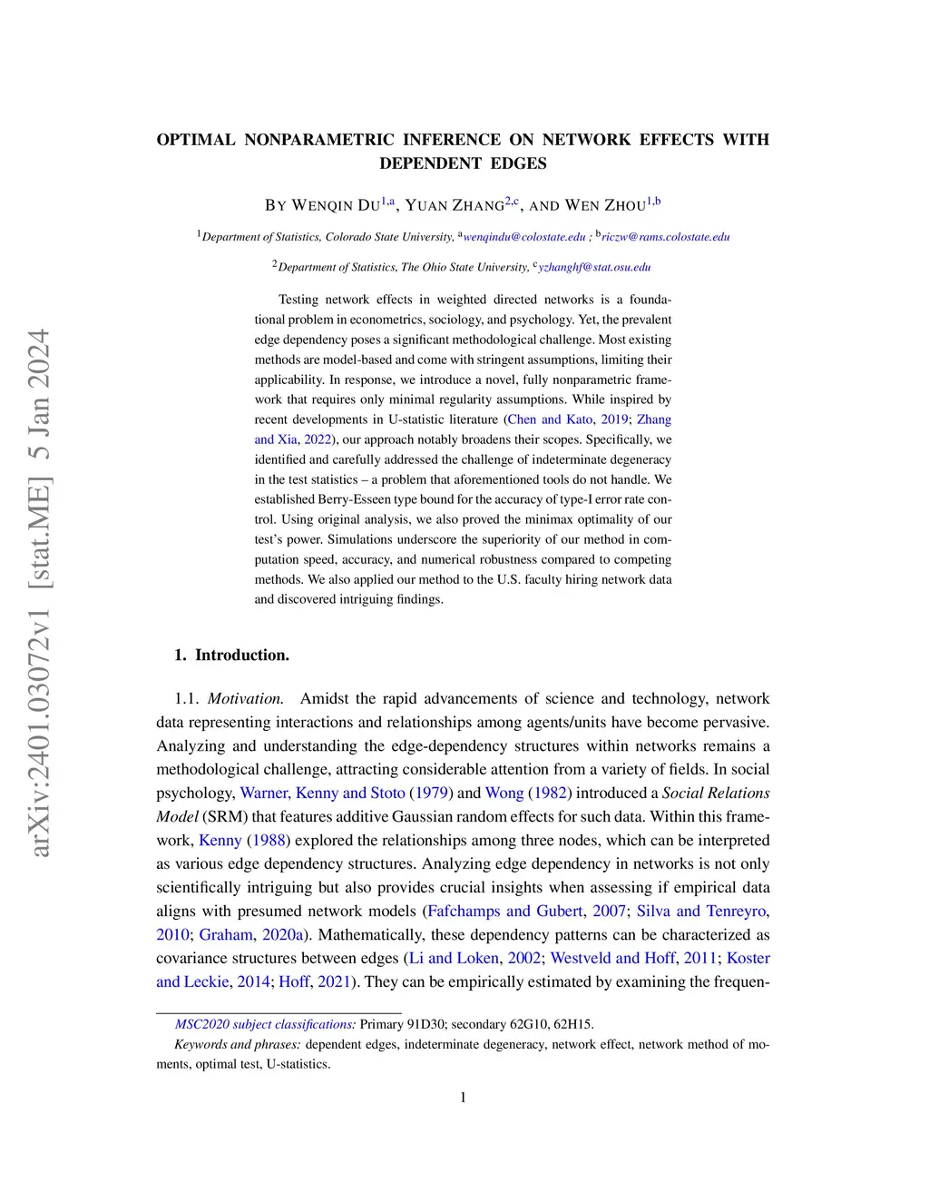 Testing network effects in weighted directed networks is a foundational problem in econometrics, sociology, and psychology. Yet, the prevalent edge dependency poses a significant methodological challenge. Most existing methods are model-based and come with stringent assumptions, limiting their applicability. In response, we introduce a novel, fully nonparametric framework that requires only minimal regularity assumptions. While inspired by recent developments in -statistic literature (arXiv:1712.00771, arXiv:2004.06615), our approach notably broadens their scopes. Specifically, we identified and carefully addressed the challenge of indeterminate degeneracy in the test statistics a problem that aforementioned tools do not handle. We established Berry-Esseen type bound for the accuracy of type-I error rate control. Using original analysis, we also proved the minimax optimality of our test's power. Simulations underscore the superiority of our method in computation speed, accuracy, and numerical robustness compared to competing methods. We also applied our method to the U.S. faculty hiring network data and discovered intriguing findings.