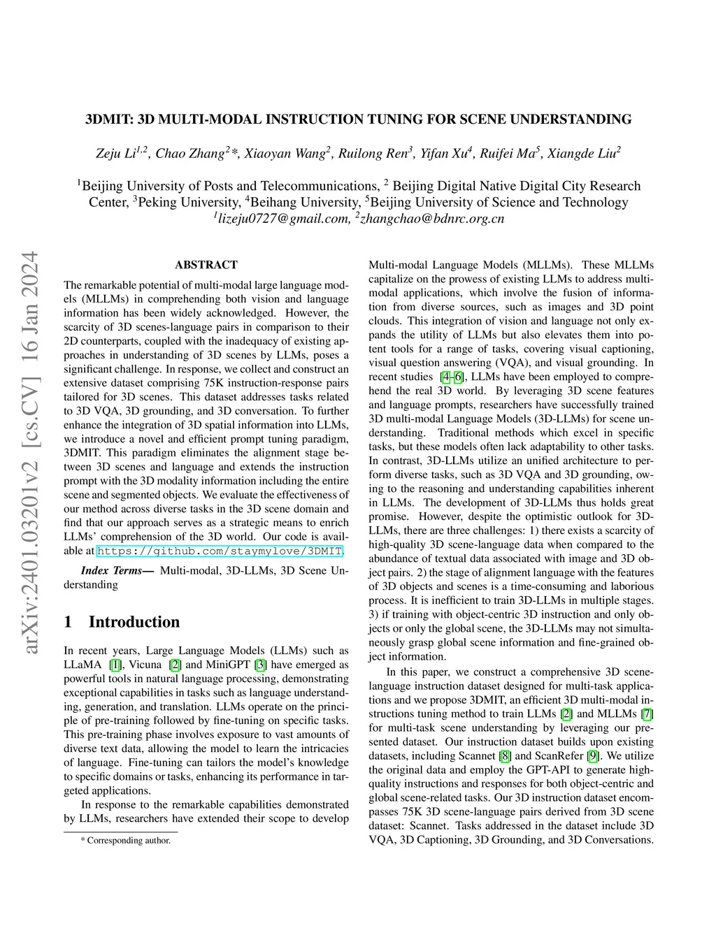 The remarkable potential of multi-modal large language models (MLLMs) in comprehending both vision and language information has been widely acknowledged. However, the scarcity of 3D scenes-language pairs in comparison to their 2D counterparts, coupled with the inadequacy of existing approaches in understanding of 3D scenes by LLMs, poses a significant challenge. In response, we collect and construct an extensive dataset comprising 75K instruction-response pairs tailored for 3D scenes. This dataset addresses tasks related to 3D VQA, 3D grounding, and 3D conversation. To further enhance the integration of 3D spatial information into LLMs, we introduce a novel and efficient prompt tuning paradigm, 3DMIT. This paradigm eliminates the alignment stage between 3D scenes and language and extends the instruction prompt with the 3D modality information including the entire scene and segmented objects. We evaluate the effectiveness of our method across diverse tasks in the 3D scene domain and find that our approach serves as a strategic means to enrich LLMs' comprehension of the 3D world. Our code is available at https://github.com/staymylove/3DMIT.