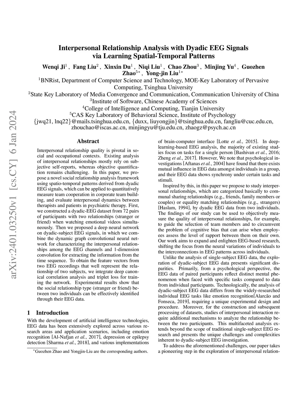 Interpersonal relationship quality is pivotal in social and occupational contexts. Existing analysis of interpersonal relationships mostly rely on subjective self-reports, whereas objective quantification remains challenging. In this paper, we propose a novel social relationship analysis framework using spatio-temporal patterns derived from dyadic EEG signals, which can be applied to quantitatively measure team cooperation in corporate team building, and evaluate interpersonal dynamics between therapists and patients in psychiatric therapy. First, we constructed a dyadic-EEG dataset from 72 pairs of participants with two relationships (stranger or friend) when watching emotional videos simultaneously. Then we proposed a deep neural network on dyadic-subject EEG signals, in which we combine the dynamic graph convolutional neural network for characterizing the interpersonal relationships among the EEG channels and 1-dimension convolution for extracting the information from the time sequence. To obtain the feature vectors from two EEG recordings that well represent the relationship of two subjects, we integrate deep canonical correlation analysis and triplet loss for training the network. Experimental results show that the social relationship type (stranger or friend) between two individuals can be effectively identified through their EEG data.