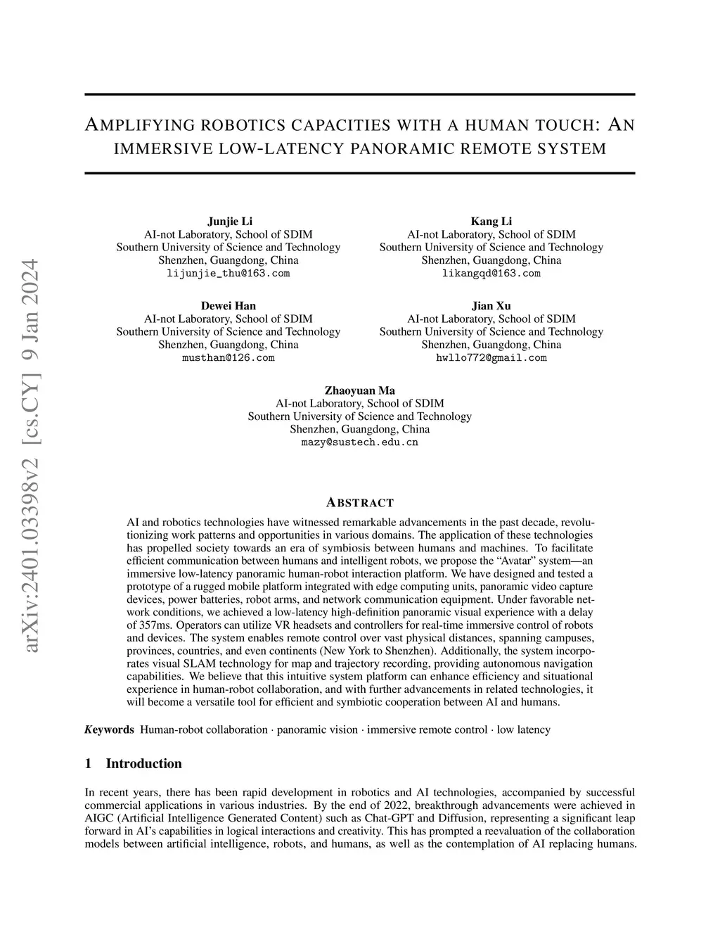 AI and robotics technologies have witnessed remarkable advancements in the past decade, revolutionizing work patterns and opportunities in various domains. The application of these technologies has propelled society towards an era of symbiosis between humans and machines. To facilitate efficient communication between humans and intelligent robots, we propose the "Avatar" system, an immersive low-latency panoramic human-robot interaction platform. We have designed and tested a prototype of a rugged mobile platform integrated with edge computing units, panoramic video capture devices, power batteries, robot arms, and network communication equipment. Under favorable network conditions, we achieved a low-latency high-definition panoramic visual experience with a delay of 357ms. Operators can utilize VR headsets and controllers for real-time immersive control of robots and devices. The system enables remote control over vast physical distances, spanning campuses, provinces, countries, and even continents (New York to Shenzhen). Additionally, the system incorporates visual SLAM technology for map and trajectory recording, providing autonomous navigation capabilities. We believe that this intuitive system platform can enhance efficiency and situational experience in human-robot collaboration, and with further advancements in related technologies, it will become a versatile tool for efficient and symbiotic cooperation between AI and humans.