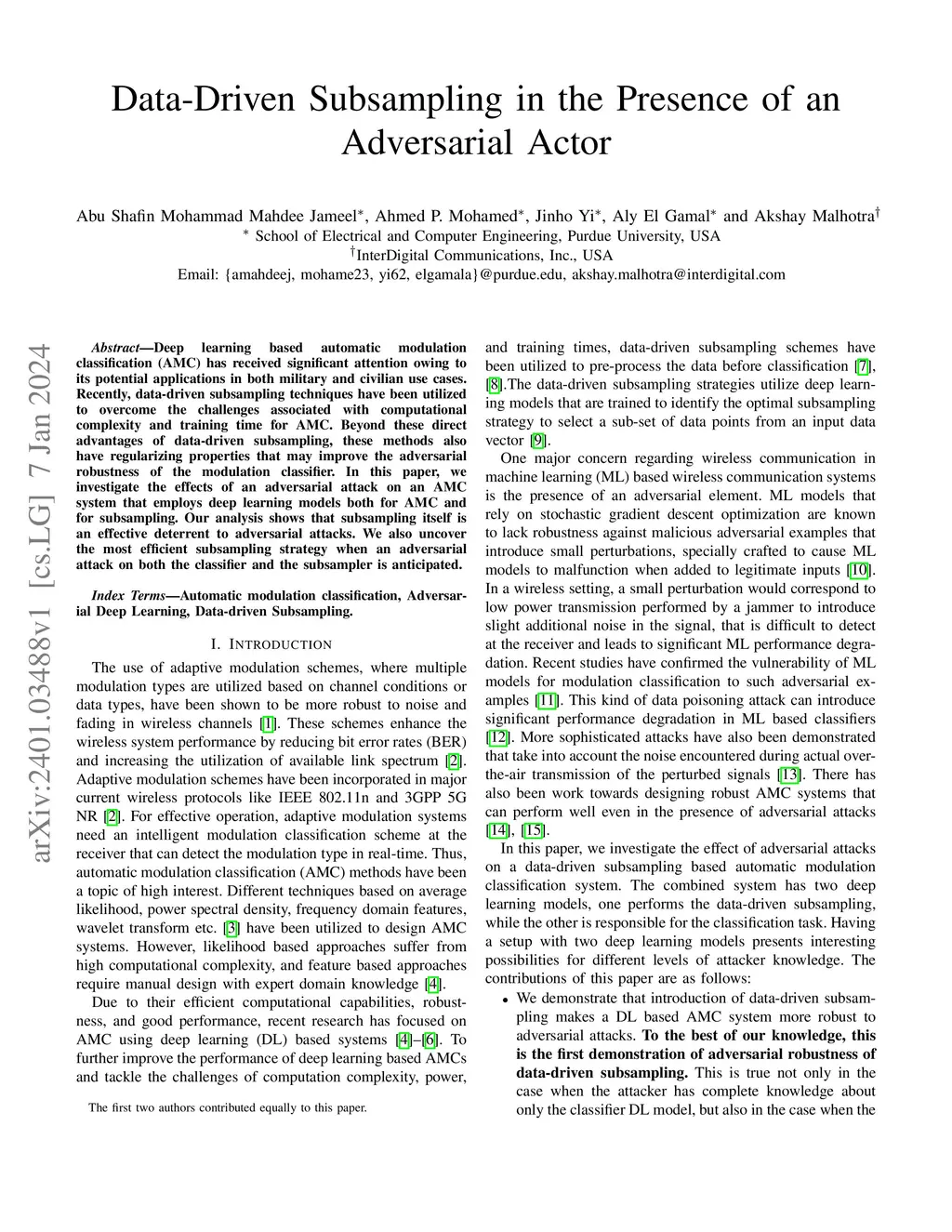 Deep learning based automatic modulation classification (AMC) has received significant attention owing to its potential applications in both military and civilian use cases. Recently, data-driven subsampling techniques have been utilized to overcome the challenges associated with computational complexity and training time for AMC. Beyond these direct advantages of data-driven subsampling, these methods also have regularizing properties that may improve the adversarial robustness of the modulation classifier. In this paper, we investigate the effects of an adversarial attack on an AMC system that employs deep learning models both for AMC and for subsampling. Our analysis shows that subsampling itself is an effective deterrent to adversarial attacks. We also uncover the most efficient subsampling strategy when an adversarial attack on both the classifier and the subsampler is anticipated.