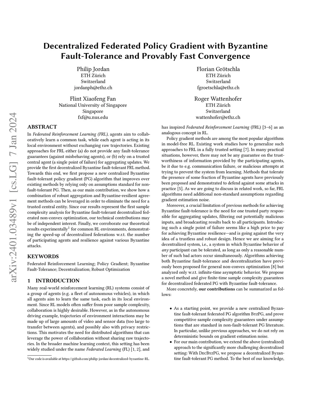 Decentralized Federated Policy Gradient with Byzantine Fault-Tolerance