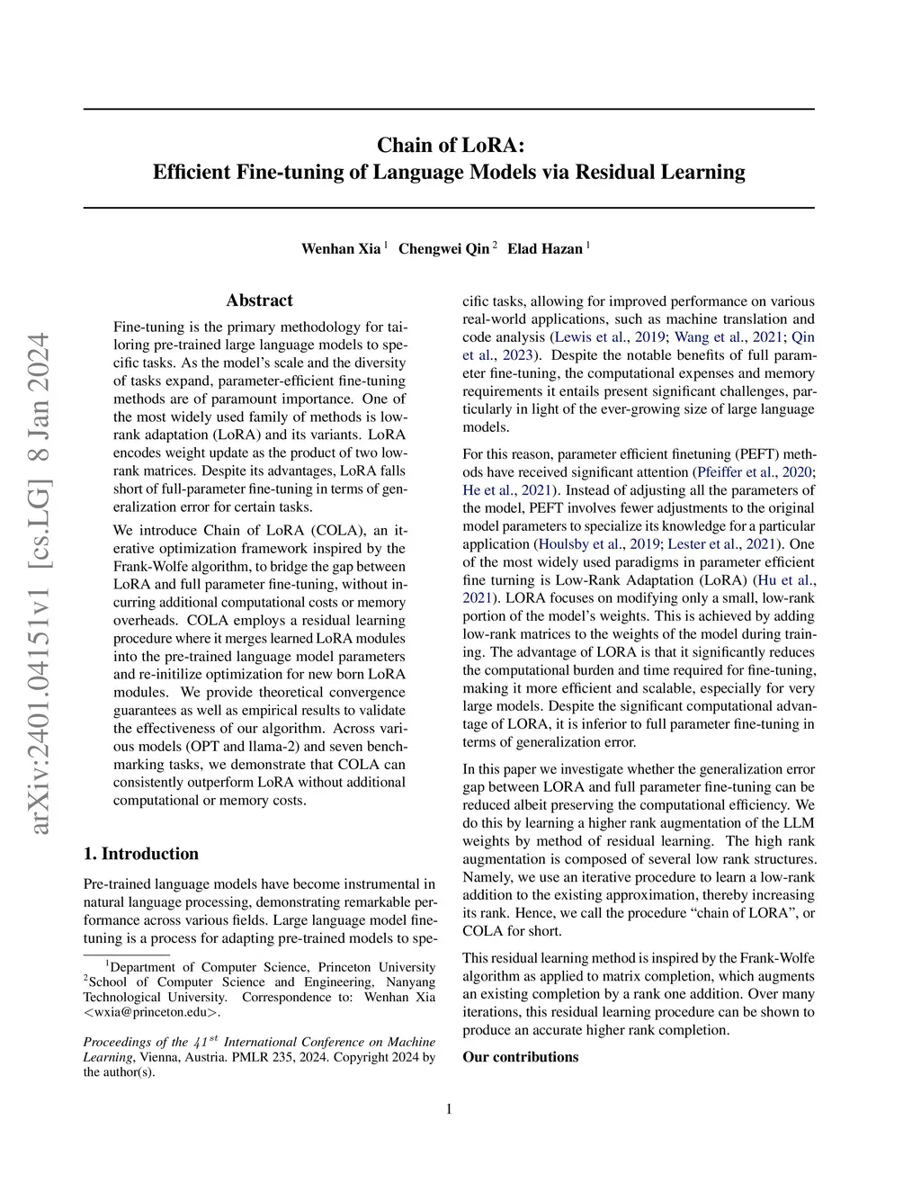 Fine-tuning is the primary methodology for tailoring pre-trained large language models to specific tasks. As the model's scale and the diversity of tasks expand, parameter-efficient fine-tuning methods are of paramount importance. One of the most widely used family of methods is low-rank adaptation (LoRA) and its variants. LoRA encodes weight update as the product of two low-rank matrices. Despite its advantages, LoRA falls short of full-parameter fine-tuning in terms of generalization error for certain tasks. We introduce Chain of LoRA (COLA), an iterative optimization framework inspired by the Frank-Wolfe algorithm, to bridge the gap between LoRA and full parameter fine-tuning, without incurring additional computational costs or memory overheads. COLA employs a residual learning procedure where it merges learned LoRA modules into the pre-trained language model parameters and re-initilize optimization for new born LoRA modules. We provide theoretical convergence guarantees as well as empirical results to validate the effectiveness of our algorithm. Across various models (OPT and llama-2) and seven benchmarking tasks, we demonstrate that COLA can consistently outperform LoRA without additional computational or memory costs.