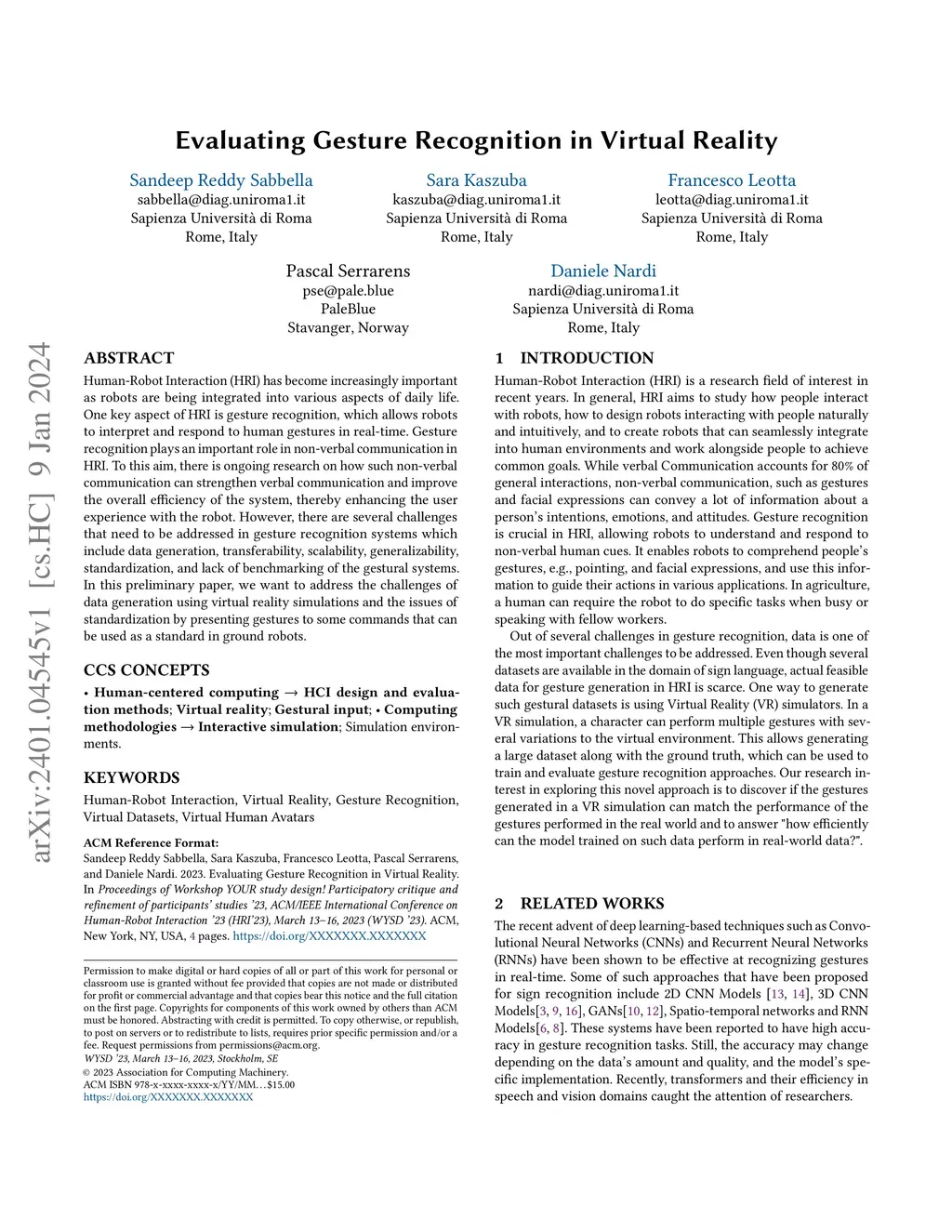 Human-Robot Interaction (HRI) has become increasingly important as robots are being integrated into various aspects of daily life. One key aspect of HRI is gesture recognition, which allows robots to interpret and respond to human gestures in real-time. Gesture recognition plays an important role in non-verbal communication in HRI. To this aim, there is ongoing research on how such non-verbal communication can strengthen verbal communication and improve the system's overall efficiency, thereby enhancing the user experience with the robot. However, several challenges need to be addressed in gesture recognition systems, which include data generation, transferability, scalability, generalizability, standardization, and lack of benchmarking of the gestural systems. In this preliminary paper, we want to address the challenges of data generation using virtual reality simulations and standardization issues by presenting gestures to some commands that can be used as a standard in ground robots.