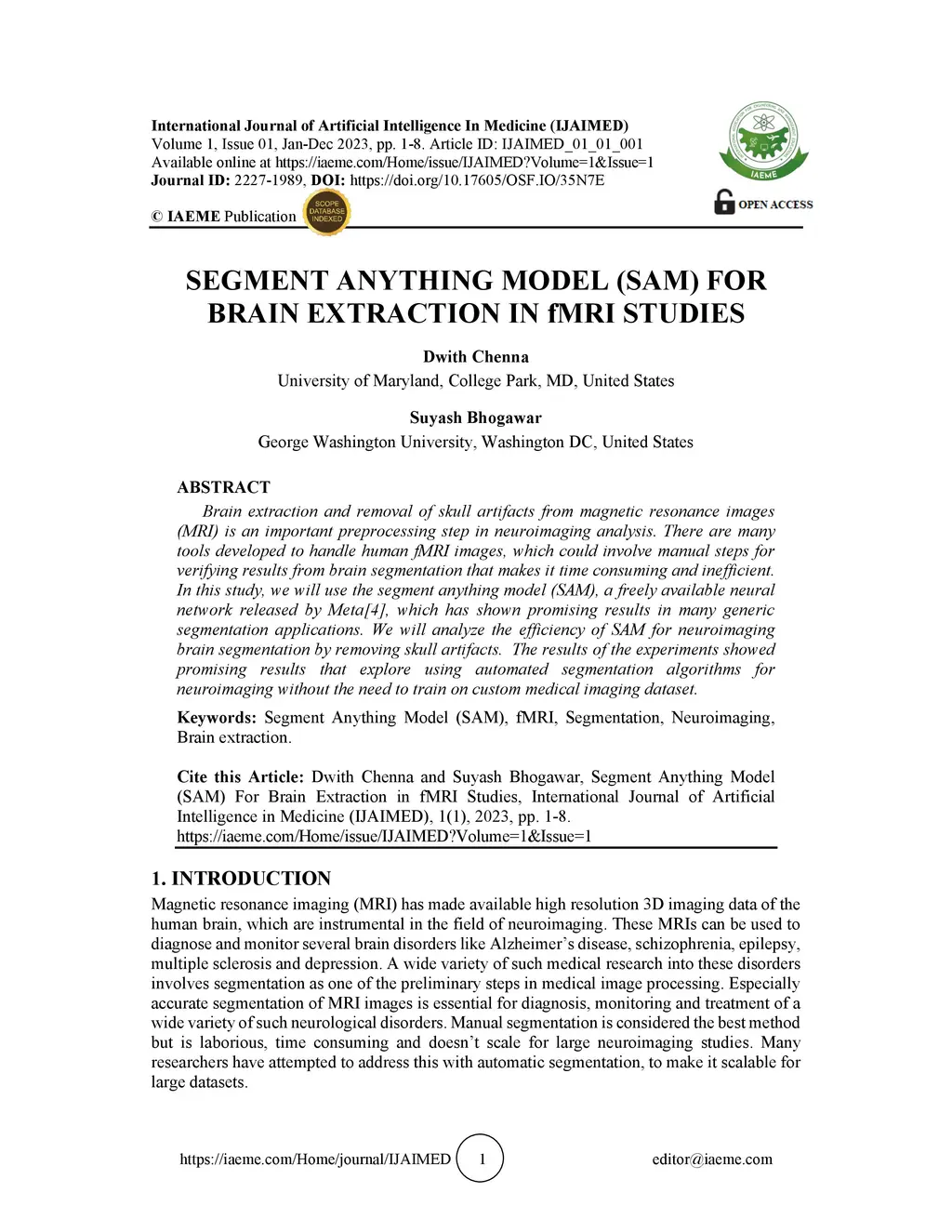 Brain extraction and removal of skull artifacts from magnetic resonance images (MRI) is an important preprocessing step in neuroimaging analysis. There are many tools developed to handle human fMRI images, which could involve manual steps for verifying results from brain segmentation that makes it time consuming and inefficient. In this study, we will use the segment anything model (SAM), a freely available neural network released by Meta[4], which has shown promising results in many generic segmentation applications. We will analyze the efficiency of SAM for neuroimaging brain segmentation by removing skull artifacts. The results of the experiments showed promising results that explore using automated segmentation algorithms for neuroimaging without the need to train on custom medical imaging dataset.