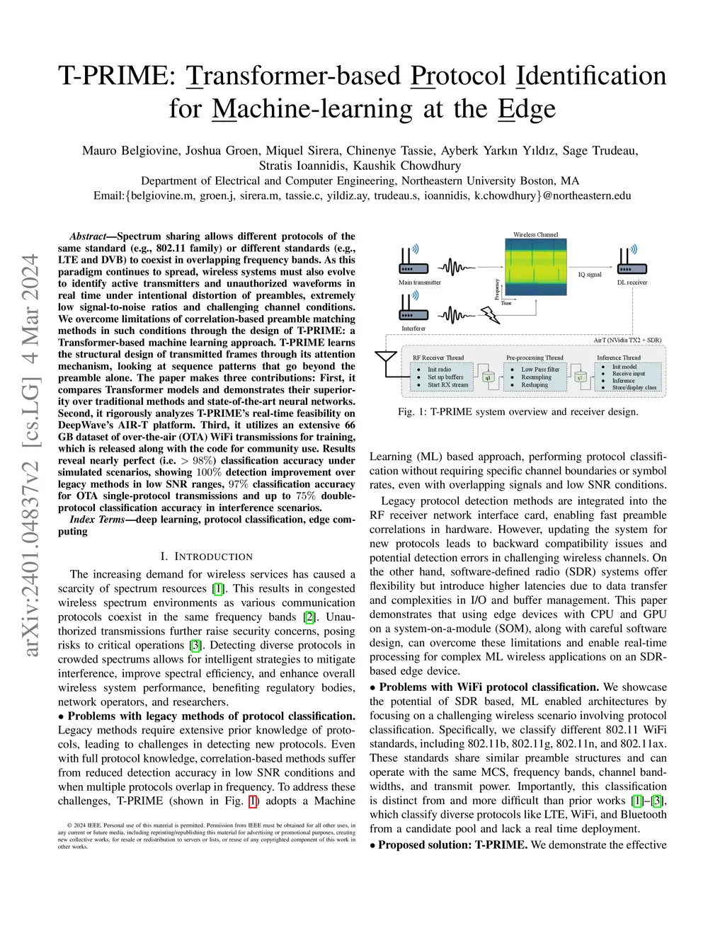 Spectrum sharing allows different protocols of the same standard (e.g., 802.11 family) or different standards (e.g., LTE and DVB) to coexist in overlapping frequency bands. As this paradigm continues to spread, wireless systems must also evolve to identify active transmitters and unauthorized waveforms in real time under intentional distortion of preambles, extremely low signal-to-noise ratios and challenging channel conditions. We overcome limitations of correlation-based preamble matching methods in such conditions through the design of T-PRIME: a Transformer-based machine learning approach. T-PRIME learns the structural design of transmitted frames through its attention mechanism, looking at sequence patterns that go beyond the preamble alone. The paper makes three contributions: First, it compares Transformer models and demonstrates their superiority over traditional methods and state-of-the-art neural networks. Second, it rigorously analyzes T-PRIME's real-time feasibility on DeepWave's AIR-T platform. Third, it utilizes an extensive 66 GB dataset of over-the-air (OTA) WiFi transmissions for training, which is released along with the code for community use. Results reveal nearly perfect (i.e. ) classification accuracy under simulated scenarios, showing detection improvement over legacy methods in low SNR ranges, classification accuracy for OTA single-protocol transmissions and up to double-protocol classification accuracy in interference scenarios.