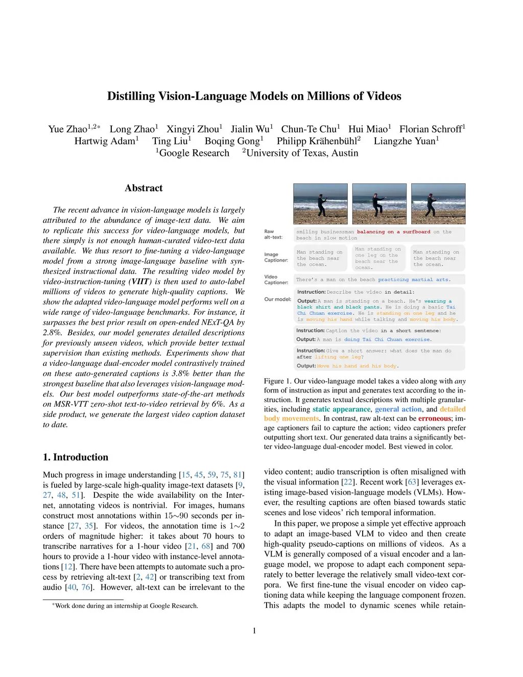 The recent advance in vision-language models is largely attributed to the abundance of image-text data. We aim to replicate this success for video-language models, but there simply is not enough human-curated video-text data available. We thus resort to fine-tuning a video-language model from a strong image-language baseline with synthesized instructional data. The resulting video model by video-instruction-tuning (VIIT) is then used to auto-label millions of videos to generate high-quality captions. We show the adapted video-language model performs well on a wide range of video-language benchmarks. For instance, it surpasses the best prior result on open-ended NExT-QA by 2.8%. Besides, our model generates detailed descriptions for previously unseen videos, which provide better textual supervision than existing methods. Experiments show that a video-language dual-encoder model contrastively trained on these auto-generated captions is 3.8% better than the strongest baseline that also leverages vision-language models. Our best model outperforms state-of-the-art methods on MSR-VTT zero-shot text-to-video retrieval by 6%. As a side product, we generate the largest video caption dataset to date.