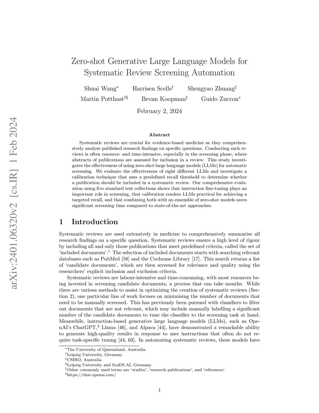 Systematic reviews are crucial for evidence-based medicine as they comprehensively analyse published research findings on specific questions. Conducting such reviews is often resource- and time-intensive, especially in the screening phase, where abstracts of publications are assessed for inclusion in a review. This study investigates the effectiveness of using zero-shot large language models~(LLMs) for automatic screening. We evaluate the effectiveness of eight different LLMs and investigate a calibration technique that uses a predefined recall threshold to determine whether a publication should be included in a systematic review. Our comprehensive evaluation using five standard test collections shows that instruction fine-tuning plays an important role in screening, that calibration renders LLMs practical for achieving a targeted recall, and that combining both with an ensemble of zero-shot models saves significant screening time compared to state-of-the-art approaches.