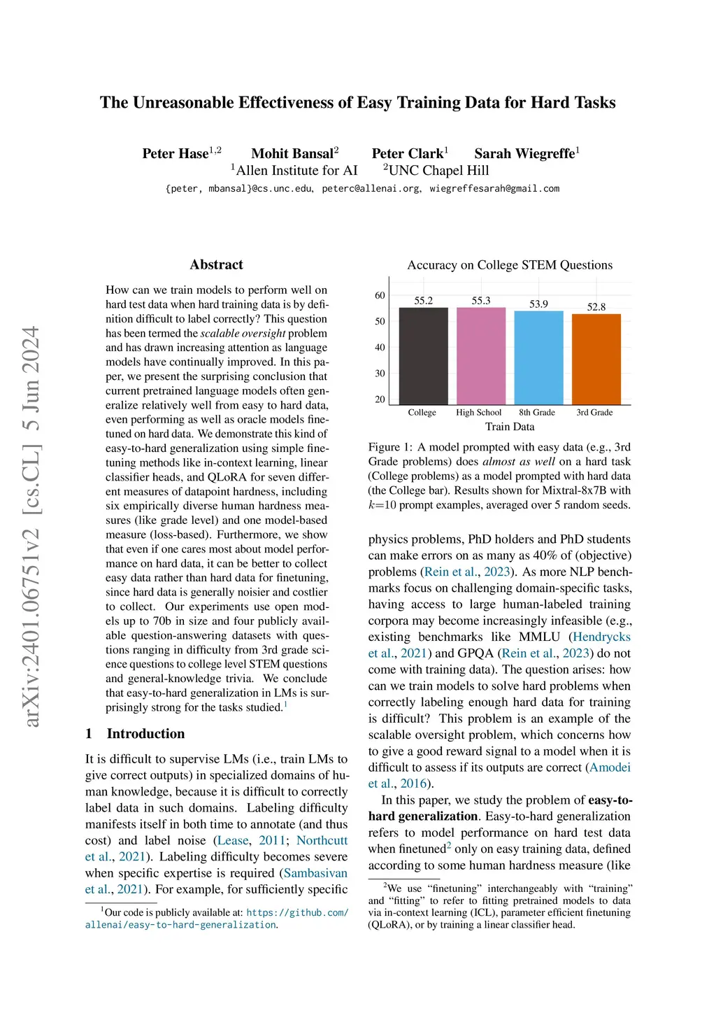 The Unreasonable Effectiveness of Easy Training Data for Hard Tasks