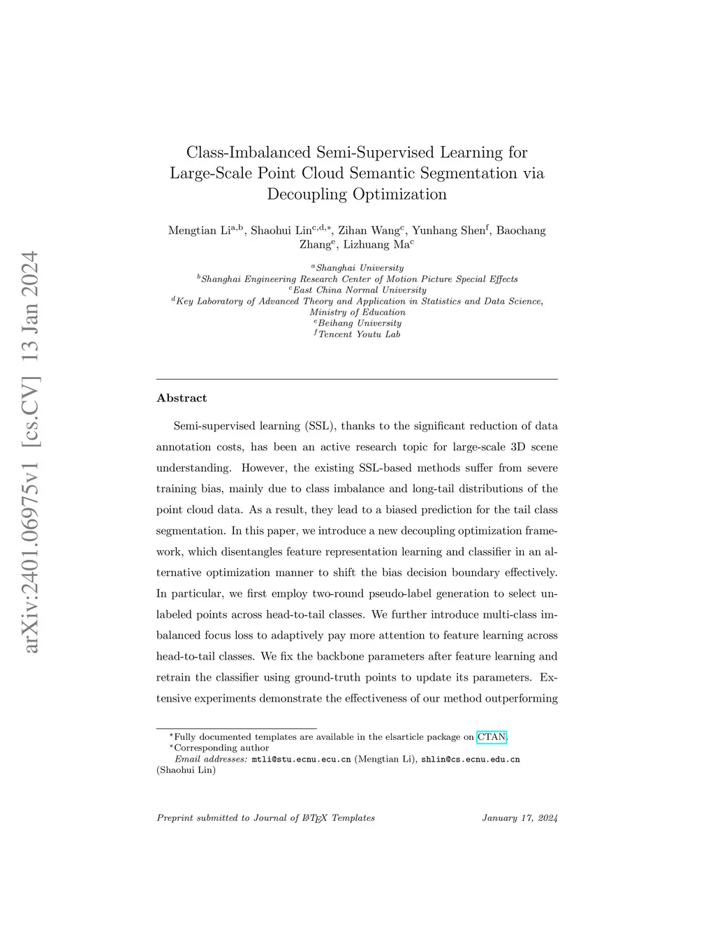 Semi-supervised learning (SSL), thanks to the significant reduction of data annotation costs, has been an active research topic for large-scale 3D scene understanding. However, the existing SSL-based methods suffer from severe training bias, mainly due to class imbalance and long-tail distributions of the point cloud data. As a result, they lead to a biased prediction for the tail class segmentation. In this paper, we introduce a new decoupling optimization framework, which disentangles feature representation learning and classifier in an alternative optimization manner to shift the bias decision boundary effectively. In particular, we first employ two-round pseudo-label generation to select unlabeled points across head-to-tail classes. We further introduce multi-class imbalanced focus loss to adaptively pay more attention to feature learning across head-to-tail classes. We fix the backbone parameters after feature learning and retrain the classifier using ground-truth points to update its parameters. Extensive experiments demonstrate the effectiveness of our method outperforming previous state-of-the-art methods on both indoor and outdoor 3D point cloud datasets (i.e., S3DIS, ScanNet-V2, Semantic3D, and SemanticKITTI) using 1% and 1pt evaluation.