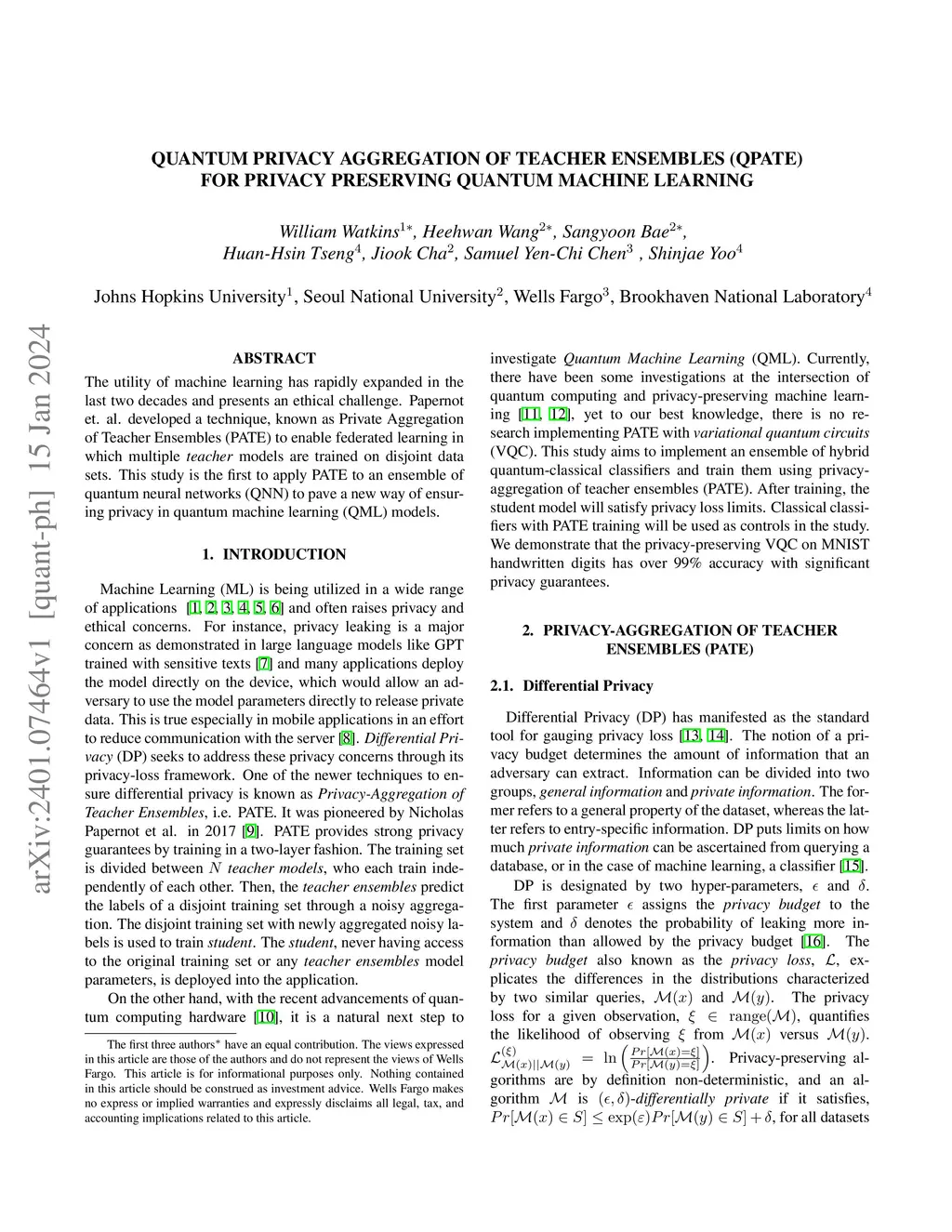 The utility of machine learning has rapidly expanded in the last two decades and presents an ethical challenge. Papernot et. al. developed a technique, known as Private Aggregation of Teacher Ensembles (PATE) to enable federated learning in which multiple teacher models are trained on disjoint datasets. This study is the first to apply PATE to an ensemble of quantum neural networks (QNN) to pave a new way of ensuring privacy in quantum machine learning (QML) models.