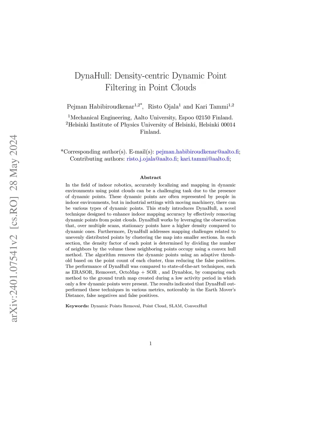 In the field of indoor robotics, accurately localizing and mapping in dynamic environments using point clouds can be a challenging task due to the presence of dynamic points. These dynamic points are often represented by people in indoor environments, but in industrial settings with moving machinery, there can be various types of dynamic points. This study introduces DynaHull, a novel technique designed to enhance indoor mapping accuracy by effectively removing dynamic points from point clouds. DynaHull works by leveraging the observation that, over multiple scans, stationary points have a higher density compared to dynamic ones. Furthermore, DynaHull addresses mapping challenges related to unevenly distributed points by clustering the map into smaller sections. In each section, the density factor of each point is determined by dividing the number of neighbors by the volume these neighboring points occupy using a convex hull method. The algorithm removes the dynamic points using an adaptive threshold based on the point count of each cluster, thus reducing the false positives. The performance of DynaHull was compared to state-of-the-art techniques, such as ERASOR, Removert, OctoMap plus SOR, and Dynablox, by comparing each method to the ground truth map created during a low activity period in which only a few dynamic points were present. The results indicated that DynaHull outperformed these techniques in various metrics, noticeably in the Earth Mover's Distance, false negatives, and false positives.