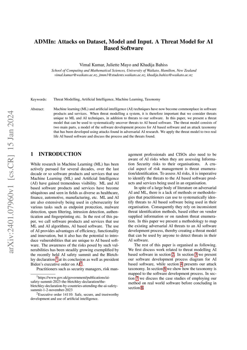 ADMIn: Attacks on Dataset, Model and Input. A Threat Model for AI Based