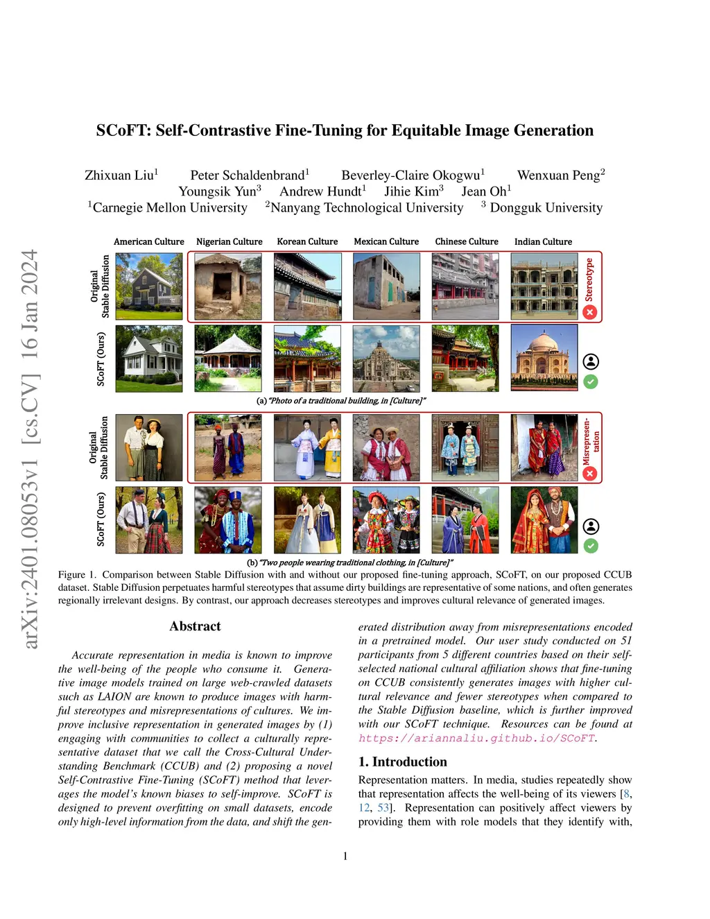 Accurate representation in media is known to improve the well-being of the people who consume it. Generative image models trained on large web-crawled datasets such as LAION are known to produce images with harmful stereotypes and misrepresentations of cultures. We improve inclusive representation in generated images by (1) engaging with communities to collect a culturally representative dataset that we call the Cross-Cultural Understanding Benchmark (CCUB) and (2) proposing a novel Self-Contrastive Fine-Tuning (SCoFT) method that leverages the model's known biases to self-improve. SCoFT is designed to prevent overfitting on small datasets, encode only high-level information from the data, and shift the generated distribution away from misrepresentations encoded in a pretrained model. Our user study conducted on 51 participants from 5 different countries based on their self-selected national cultural affiliation shows that fine-tuning on CCUB consistently generates images with higher cultural relevance and fewer stereotypes when compared to the Stable Diffusion baseline, which is further improved with our SCoFT technique.