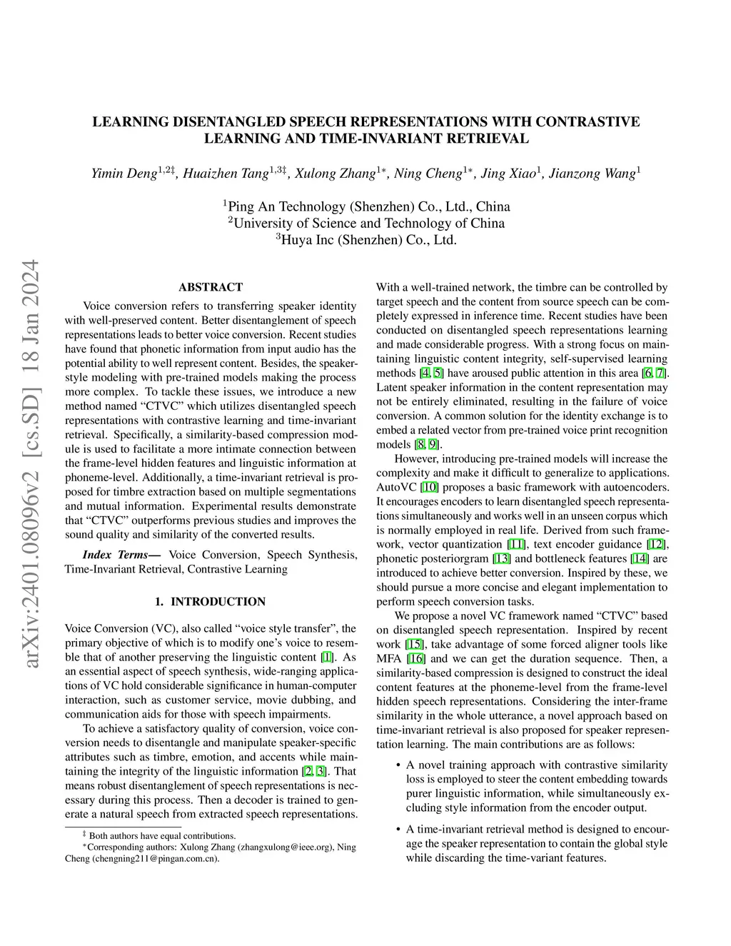 Voice conversion refers to transferring speaker identity with well-preserved content. Better disentanglement of speech representations leads to better voice conversion. Recent studies have found that phonetic information from input audio has the potential ability to well represent content. Besides, the speaker-style modeling with pre-trained models making the process more complex. To tackle these issues, we introduce a new method named "CTVC" which utilizes disentangled speech representations with contrastive learning and time-invariant retrieval. Specifically, a similarity-based compression module is used to facilitate a more intimate connection between the frame-level hidden features and linguistic information at phoneme-level. Additionally, a time-invariant retrieval is proposed for timbre extraction based on multiple segmentations and mutual information. Experimental results demonstrate that "CTVC" outperforms previous studies and improves the sound quality and similarity of converted results.