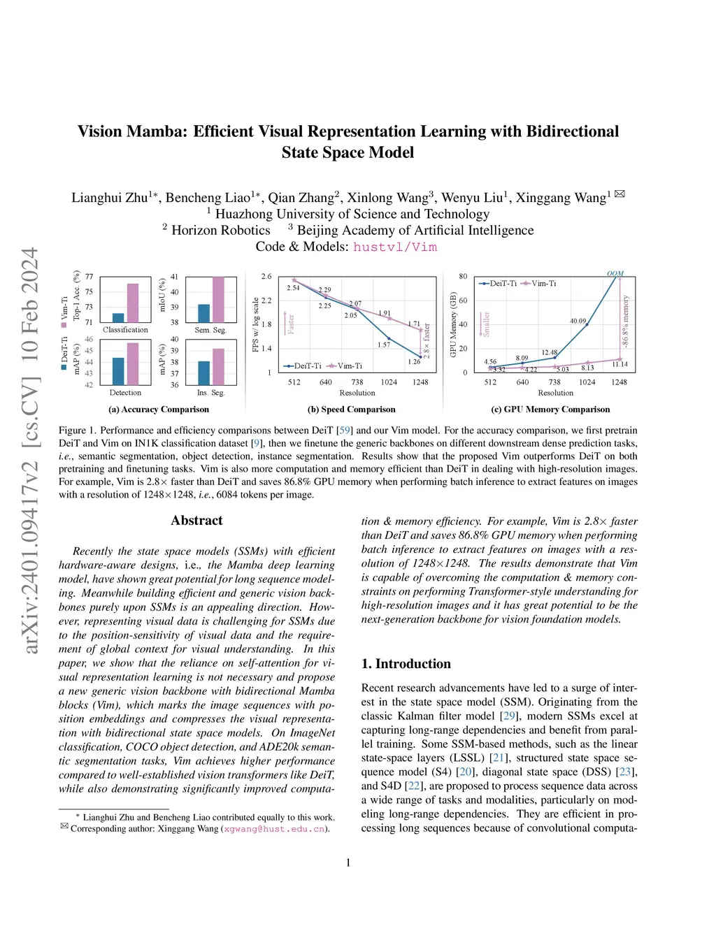Recently the state space models (SSMs) with efficient hardware-aware designs, i.e., the Mamba deep learning model, have shown great potential for long sequence modeling. Meanwhile building efficient and generic vision backbones purely upon SSMs is an appealing direction. However, representing visual data is challenging for SSMs due to the position-sensitivity of visual data and the requirement of global context for visual understanding. In this paper, we show that the reliance on self-attention for visual representation learning is not necessary and propose a new generic vision backbone with bidirectional Mamba blocks (Vim), which marks the image sequences with position embeddings and compresses the visual representation with bidirectional state space models. On ImageNet classification, COCO object detection, and ADE20k semantic segmentation tasks, Vim achieves higher performance compared to well-established vision transformers like DeiT, while also demonstrating significantly improved computation & memory efficiency. For example, Vim is 2.8 faster than DeiT and saves 86.8% GPU memory when performing batch inference to extract features on images with a resolution of 12481248. The results demonstrate that Vim is capable of overcoming the computation & memory constraints on performing Transformer-style understanding for high-resolution images and it has great potential to be the next-generation backbone for vision foundation models. Code is available at https://github.com/hustvl/Vim.