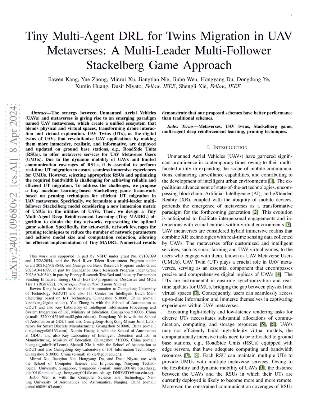 The synergy between Unmanned Aerial Vehicles (UAVs) and metaverses is giving rise to an emerging paradigm named UAV metaverses, which create a unified ecosystem that blends physical and virtual spaces, transforming drone interaction and virtual exploration. UAV Twins (UTs), as the digital twins of UAVs that revolutionize UAV applications by making them more immersive, realistic, and informative, are deployed and updated on ground base stations, e.g., RoadSide Units (RSUs), to offer metaverse services for UAV Metaverse Users (UMUs). Due to the dynamic mobility of UAVs and limited communication coverages of RSUs, it is essential to perform real-time UT migration to ensure seamless immersive experiences for UMUs. However, selecting appropriate RSUs and optimizing the required bandwidth is challenging for achieving reliable and efficient UT migration. To address the challenges, we propose a tiny machine learning-based Stackelberg game framework based on pruning techniques for efficient UT migration in UAV metaverses. Specifically, we formulate a multi-leader multi-follower Stackelberg model considering a new immersion metric of UMUs in the utilities of UAVs. Then, we design a Tiny Multi-Agent Deep Reinforcement Learning (Tiny MADRL) algorithm to obtain the tiny networks representing the optimal game solution. Specifically, the actor-critic network leverages the pruning techniques to reduce the number of network parameters and achieve model size and computation reduction, allowing for efficient implementation of Tiny MADRL. Numerical results demonstrate that our proposed schemes have better performance than traditional schemes.