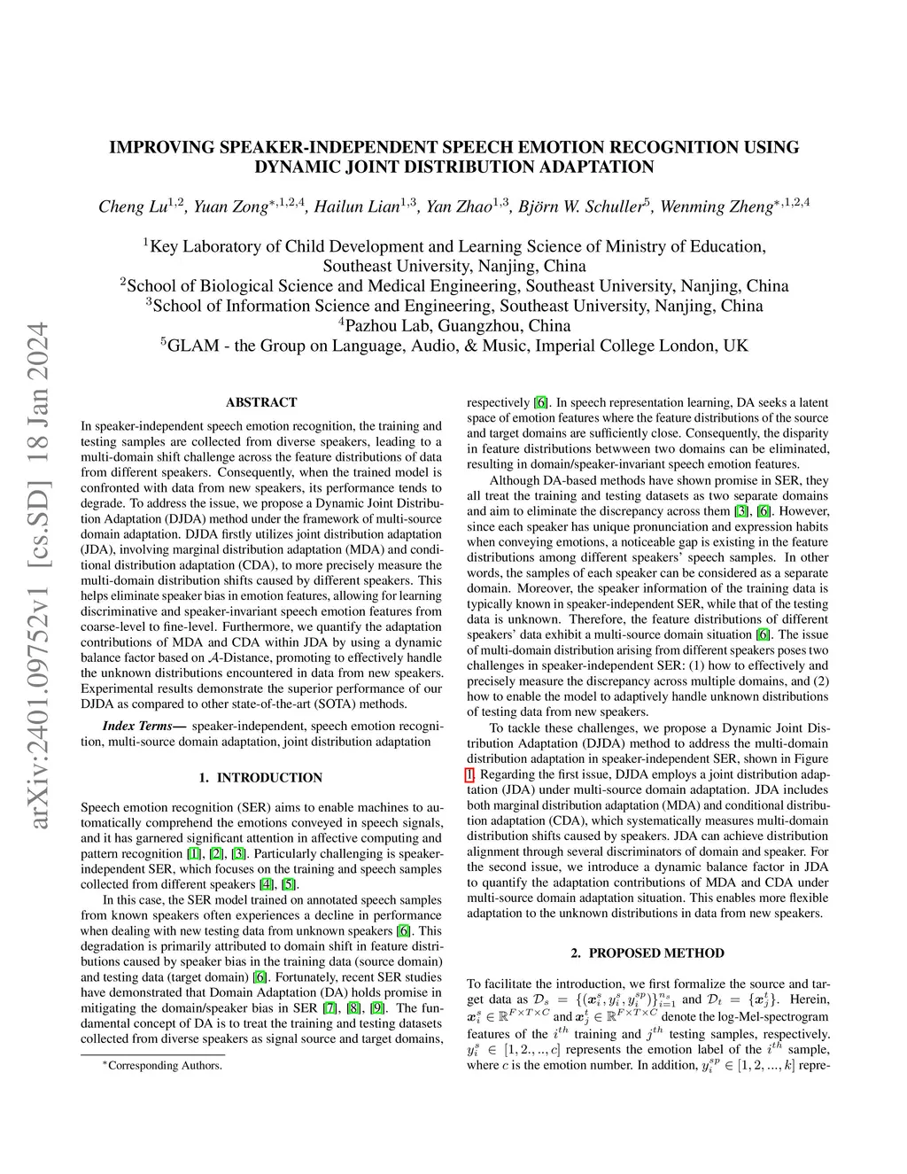 In speaker-independent speech emotion recognition, the training and testing samples are collected from diverse speakers, leading to a multi-domain shift challenge across the feature distributions of data from different speakers. Consequently, when the trained model is confronted with data from new speakers, its performance tends to degrade. To address the issue, we propose a Dynamic Joint Distribution Adaptation (DJDA) method under the framework of multi-source domain adaptation. DJDA firstly utilizes joint distribution adaptation (JDA), involving marginal distribution adaptation (MDA) and conditional distribution adaptation (CDA), to more precisely measure the multi-domain distribution shifts caused by different speakers. This helps eliminate speaker bias in emotion features, allowing for learning discriminative and speaker-invariant speech emotion features from coarse-level to fine-level. Furthermore, we quantify the adaptation contributions of MDA and CDA within JDA by using a dynamic balance factor based on -Distance, promoting to effectively handle the unknown distributions encountered in data from new speakers. Experimental results demonstrate the superior performance of our DJDA as compared to other state-of-the-art (SOTA) methods.