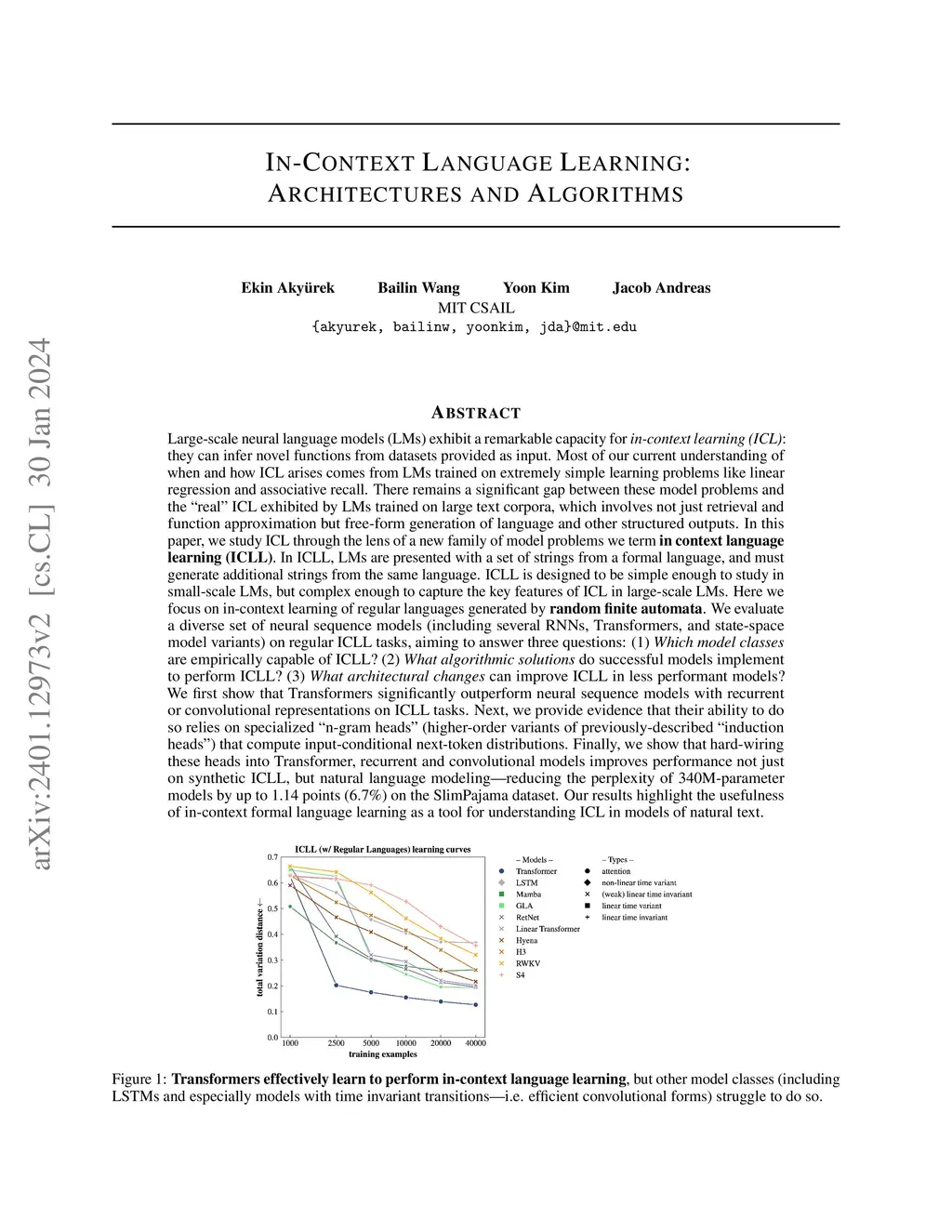 Large-scale neural language models exhibit a remarkable capacity for in-context learning (ICL): they can infer novel functions from datasets provided as input. Most of our current understanding of when and how ICL arises comes from LMs trained on extremely simple learning problems like linear regression and associative recall. There remains a significant gap between these model problems and the "real" ICL exhibited by LMs trained on large text corpora, which involves not just retrieval and function approximation but free-form generation of language and other structured outputs. In this paper, we study ICL through the lens of a new family of model problems we term in context language learning (ICLL). In ICLL, LMs are presented with a set of strings from a formal language, and must generate additional strings from the same language. We focus on in-context learning of regular languages generated by random finite automata. We evaluate a diverse set of neural sequence models (including several RNNs, Transformers, and state-space model variants) on regular ICLL tasks, aiming to answer three questions: (1) Which model classes are empirically capable of ICLL? (2) What algorithmic solutions do successful models implement to perform ICLL? (3) What architectural changes can improve ICLL in less performant models? We first show that Transformers significantly outperform neural sequence models with recurrent or convolutional representations on ICLL tasks. Next, we provide evidence that their ability to do so relies on specialized "n-gram heads" (higher-order variants of induction heads) that compute input-conditional next-token distributions. Finally, we show that hard-wiring these heads into neural models improves performance not just on ICLL, but natural language modeling -- improving the perplexity of 340M-parameter models by up to 1.14 points (6.7%) on the SlimPajama dataset.