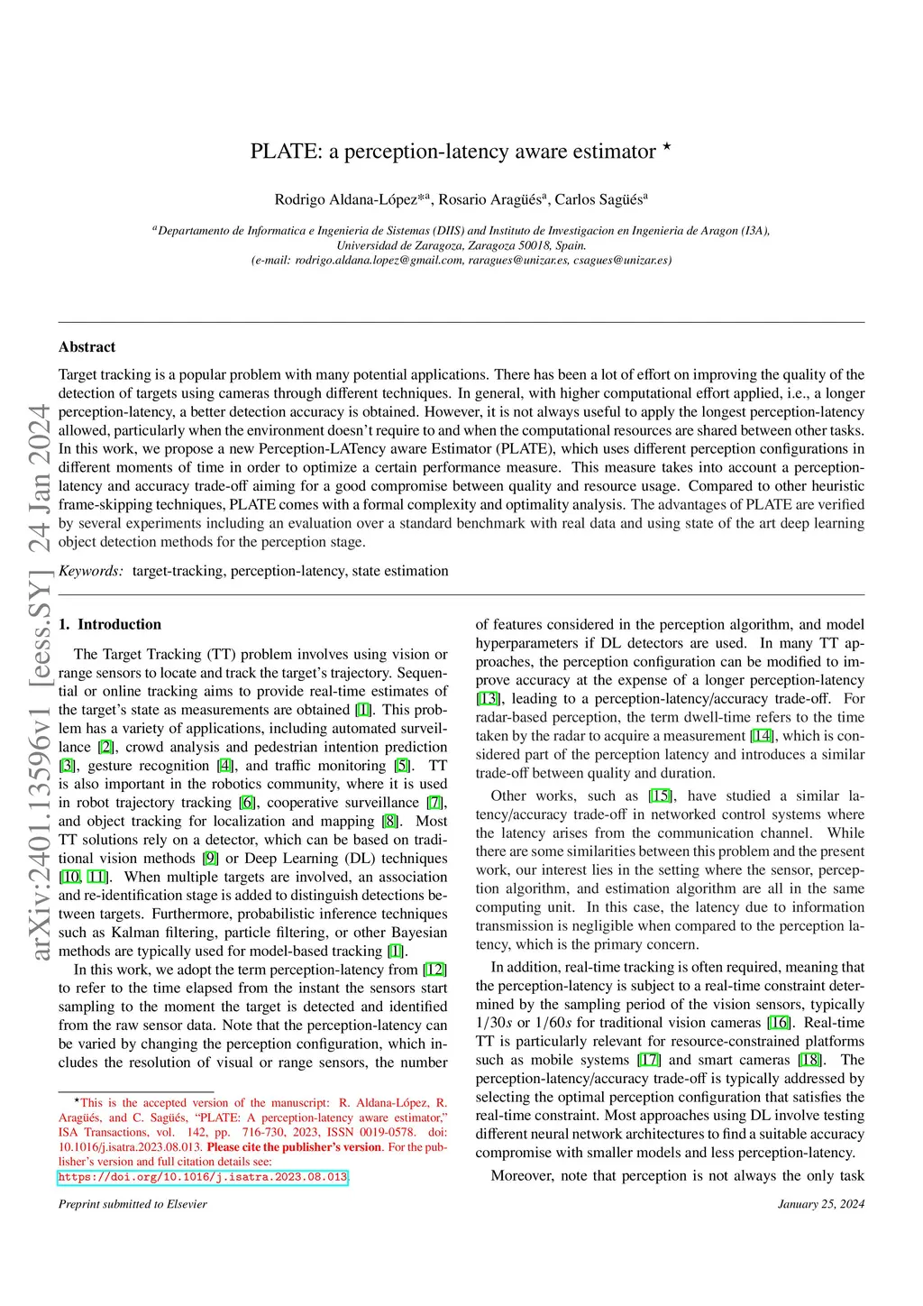 Target tracking is a popular problem with many potential applications. There has been a lot of effort on improving the quality of the detection of targets using cameras through different techniques. In general, with higher computational effort applied, i.e., a longer perception-latency, a better detection accuracy is obtained. However, it is not always useful to apply the longest perception-latency allowed, particularly when the environment doesn't require to and when the computational resources are shared between other tasks. In this work, we propose a new Perception-LATency aware Estimator (PLATE), which uses different perception configurations in different moments of time in order to optimize a certain performance measure. This measure takes into account a perception-latency and accuracy trade-off aiming for a good compromise between quality and resource usage. Compared to other heuristic frame-skipping techniques, PLATE comes with a formal complexity and optimality analysis. The advantages of PLATE are verified by several experiments including an evaluation over a standard benchmark with real data and using state of the art deep learning object detection methods for the perception stage.