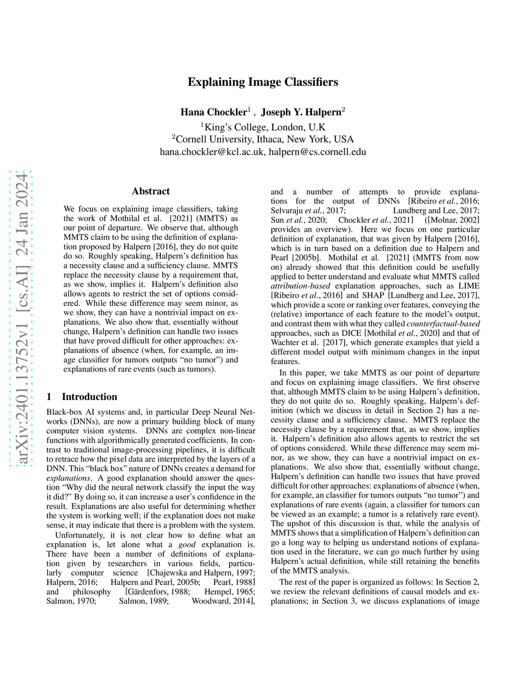 We focus on explaining image classifiers, taking the work of Mothilal et al. [2021] (MMTS) as our point of departure. We observe that, although MMTS claim to be using the definition of explanation proposed by Halpern [2016], they do not quite do so. Roughly speaking, Halpern's definition has a necessity clause and a sufficiency clause. MMTS replace the necessity clause by a requirement that, as we show, implies it. Halpern's definition also allows agents to restrict the set of options considered. While these difference may seem minor, as we show, they can have a nontrivial impact on explanations. We also show that, essentially without change, Halpern's definition can handle two issues that have proved difficult for other approaches: explanations of absence (when, for example, an image classifier for tumors outputs "no tumor") and explanations of rare events (such as tumors).