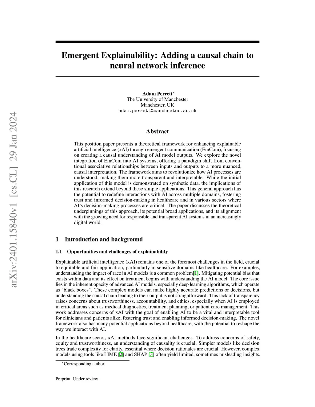 This position paper presents a theoretical framework for enhancing explainable artificial intelligence (xAI) through emergent communication (EmCom), focusing on creating a causal understanding of AI model outputs. We explore the novel integration of EmCom into AI systems, offering a paradigm shift from conventional associative relationships between inputs and outputs to a more nuanced, causal interpretation. The framework aims to revolutionize how AI processes are understood, making them more transparent and interpretable. While the initial application of this model is demonstrated on synthetic data, the implications of this research extend beyond these simple applications. This general approach has the potential to redefine interactions with AI across multiple domains, fostering trust and informed decision-making in healthcare and in various sectors where AI's decision-making processes are critical. The paper discusses the theoretical underpinnings of this approach, its potential broad applications, and its alignment with the growing need for responsible and transparent AI systems in an increasingly digital world.
