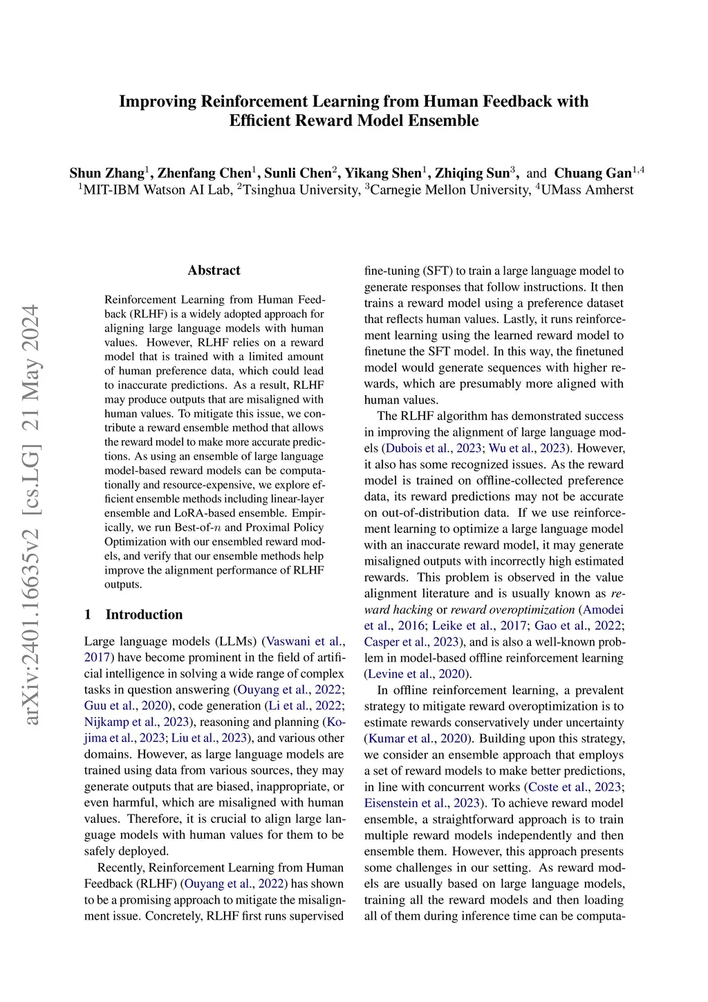 Reinforcement Learning from Human Feedback (RLHF) is a widely adopted approach for aligning large language models with human values. However, RLHF relies on a reward model that is trained with a limited amount of human preference data, which could lead to inaccurate predictions. As a result, RLHF may produce outputs that are misaligned with human values. To mitigate this issue, we contribute a reward ensemble method that allows the reward model to make more accurate predictions. As using an ensemble of large language model-based reward models can be computationally and resource-expensive, we explore efficient ensemble methods including linear-layer ensemble and LoRA-based ensemble. Empirically, we run Best-of- and Proximal Policy Optimization with our ensembled reward models, and verify that our ensemble methods help improve the alignment performance of RLHF outputs.