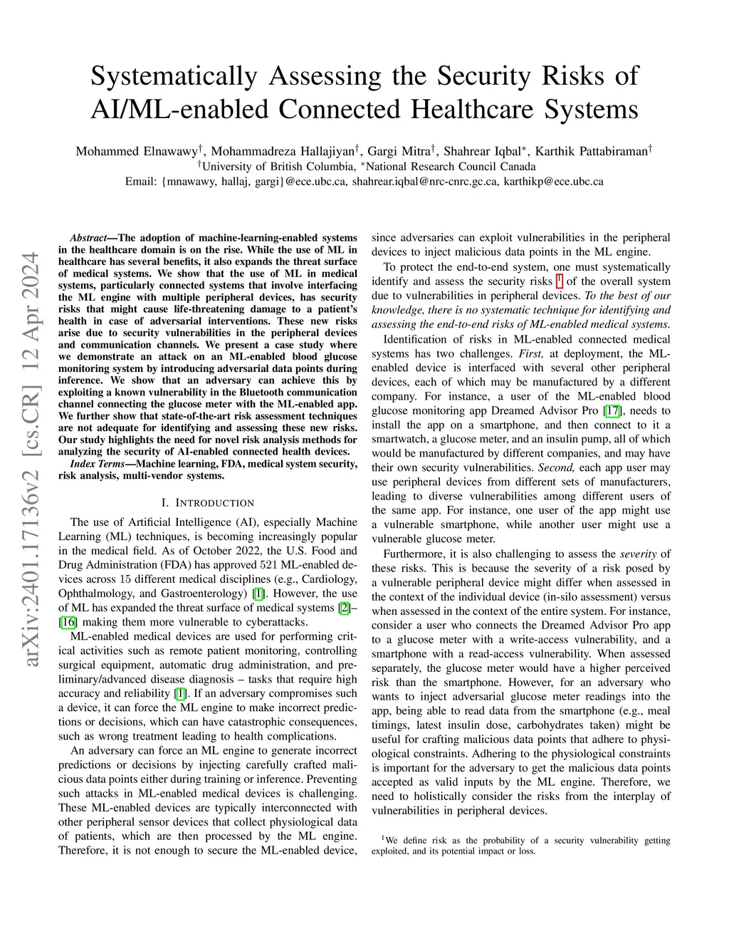 The adoption of machine-learning-enabled systems in the healthcare domain is on the rise. While the use of ML in healthcare has several benefits, it also expands the threat surface of medical systems. We show that the use of ML in medical systems, particularly connected systems that involve interfacing the ML engine with multiple peripheral devices, has security risks that might cause life-threatening damage to a patient's health in case of adversarial interventions. These new risks arise due to security vulnerabilities in the peripheral devices and communication channels. We present a case study where we demonstrate an attack on an ML-enabled blood glucose monitoring system by introducing adversarial data points during inference. We show that an adversary can achieve this by exploiting a known vulnerability in the Bluetooth communication channel connecting the glucose meter with the ML-enabled app. We further show that state-of-the-art risk assessment techniques are not adequate for identifying and assessing these new risks. Our study highlights the need for novel risk analysis methods for analyzing the security of AI-enabled connected health devices.