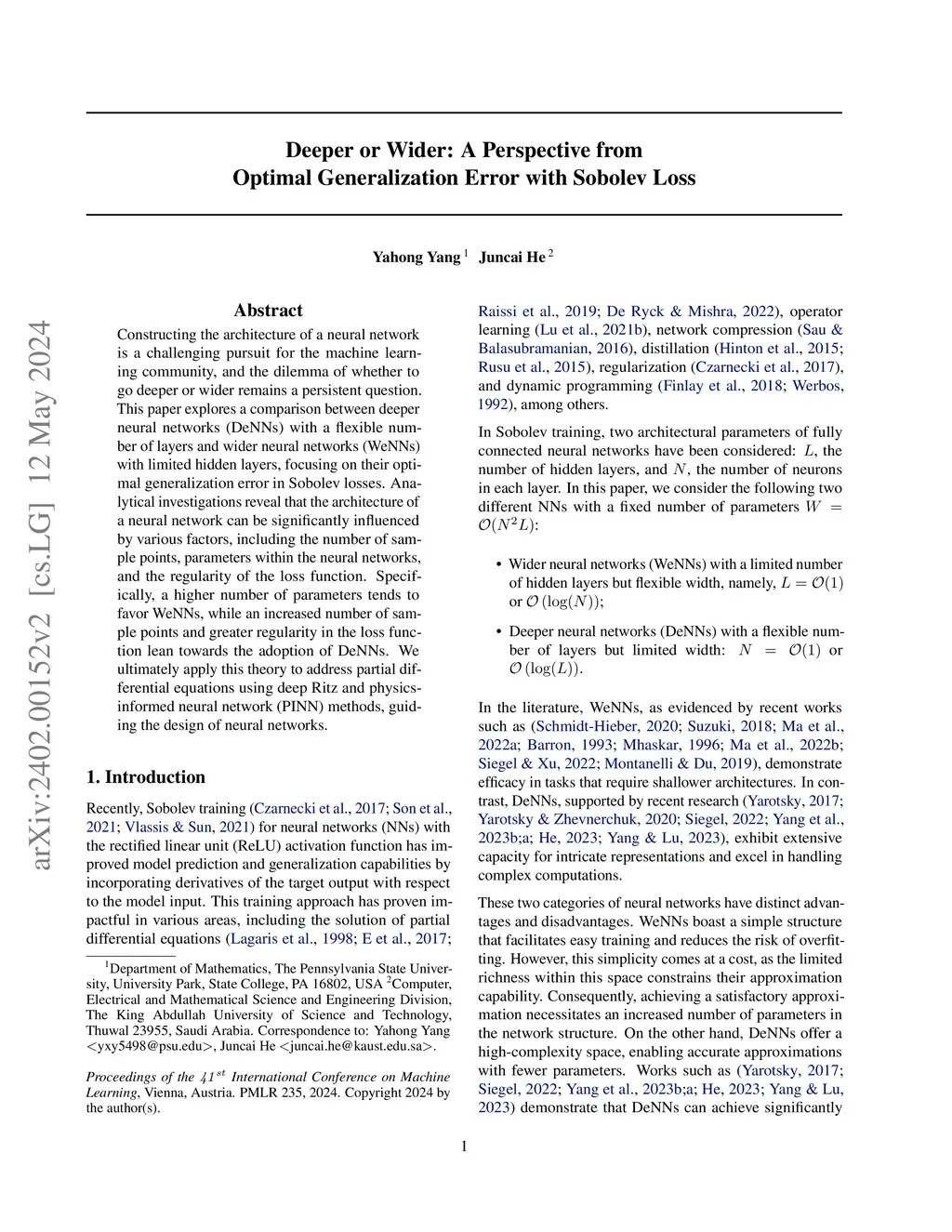 Constructing the architecture of a neural network is a challenging pursuit for the machine learning community, and the dilemma of whether to go deeper or wider remains a persistent question. This paper explores a comparison between deeper neural networks (DeNNs) with a flexible number of layers and wider neural networks (WeNNs) with limited hidden layers, focusing on their optimal generalization error in Sobolev losses. Analytical investigations reveal that the architecture of a neural network can be significantly influenced by various factors, including the number of sample points, parameters within the neural networks, and the regularity of the loss function. Specifically, a higher number of parameters tends to favor WeNNs, while an increased number of sample points and greater regularity in the loss function lean towards the adoption of DeNNs. We ultimately apply this theory to address partial differential equations using deep Ritz and physics-informed neural network (PINN) methods, guiding the design of neural networks.