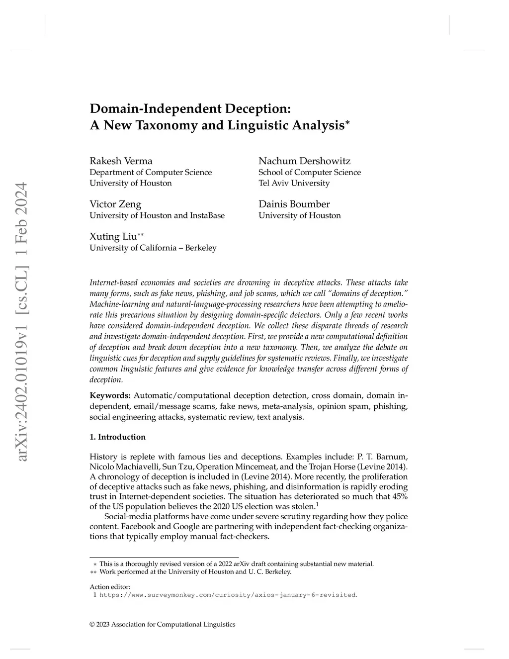 Internet-based economies and societies are drowning in deceptive attacks. These attacks take many forms, such as fake news, phishing, and job scams, which we call ``domains of deception.'' Machine-learning and natural-language-processing researchers have been attempting to ameliorate this precarious situation by designing domain-specific detectors. Only a few recent works have considered domain-independent deception. We collect these disparate threads of research and investigate domain-independent deception. First, we provide a new computational definition of deception and break down deception into a new taxonomy. Then, we analyze the debate on linguistic cues for deception and supply guidelines for systematic reviews. Finally, we investigate common linguistic features and give evidence for knowledge transfer across different forms of deception.