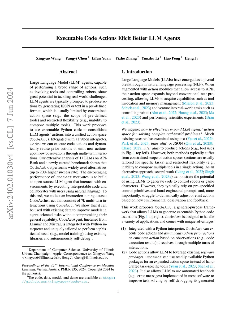 Large Language Model (LLM) agents, capable of performing a broad range of actions, such as invoking tools and controlling robots, show great potential in tackling real-world challenges. LLM agents are typically prompted to produce actions by generating JSON or text in a pre-defined format, which is usually limited by constrained action space (e.g., the scope of pre-defined tools) and restricted flexibility (e.g., inability to compose multiple tools). This work proposes to use executable Python code to consolidate LLM agents' actions into a unified action space (CodeAct). Integrated with a Python interpreter, CodeAct can execute code actions and dynamically revise prior actions or emit new actions upon new observations through multi-turn interactions. Our extensive analysis of 17 LLMs on API-Bank and a newly curated benchmark shows that CodeAct outperforms widely used alternatives (up to 20% higher success rate). The encouraging performance of CodeAct motivates us to build an open-source LLM agent that interacts with environments by executing interpretable code and collaborates with users using natural language. To this end, we collect an instruction-tuning dataset CodeActInstruct that consists of 7k multi-turn interactions using CodeAct. We show that it can be used with existing data to improve models in agent-oriented tasks without compromising their general capability. CodeActAgent, finetuned from Llama2 and Mistral, is integrated with Python interpreter and uniquely tailored to perform sophisticated tasks (e.g., model training) using existing libraries and autonomously self-debug.
