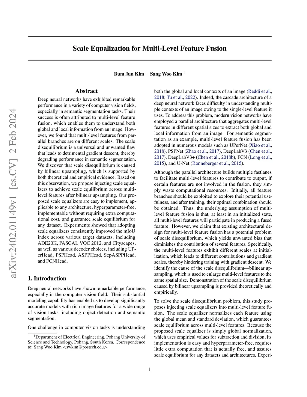 Deep neural networks have exhibited remarkable performance in a variety of computer vision fields, especially in semantic segmentation tasks. Their success is often attributed to multi-level feature fusion, which enables them to understand both global and local information from an image. However, we found that multi-level features from parallel branches are on different scales. The scale disequilibrium is a universal and unwanted flaw that leads to detrimental gradient descent, thereby degrading performance in semantic segmentation. We discover that scale disequilibrium is caused by bilinear upsampling, which is supported by both theoretical and empirical evidence. Based on this observation, we propose injecting scale equalizers to achieve scale equilibrium across multi-level features after bilinear upsampling. Our proposed scale equalizers are easy to implement, applicable to any architecture, hyperparameter-free, implementable without requiring extra computational cost, and guarantee scale equilibrium for any dataset. Experiments showed that adopting scale equalizers consistently improved the mIoU index across various target datasets, including ADE20K, PASCAL VOC 2012, and Cityscapes, as well as various decoder choices, including UPerHead, PSPHead, ASPPHead, SepASPPHead, and FCNHead.
