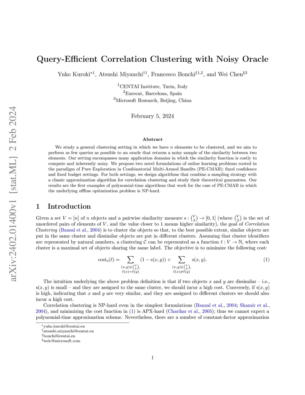 We study a general clustering setting in which we have elements to be clustered, and we aim to perform as few queries as possible to an oracle that returns a noisy sample of the similarity between two elements. Our setting encompasses many application domains in which the similarity function is costly to compute and inherently noisy. We propose two novel formulations of online learning problems rooted in the paradigm of Pure Exploration in Combinatorial Multi-Armed Bandits (PE-CMAB): fixed confidence and fixed budget settings. For both settings, we design algorithms that combine a sampling strategy with a classic approximation algorithm for correlation clustering and study their theoretical guarantees. Our results are the first examples of polynomial-time algorithms that work for the case of PE-CMAB in which the underlying offline optimization problem is NP-hard.