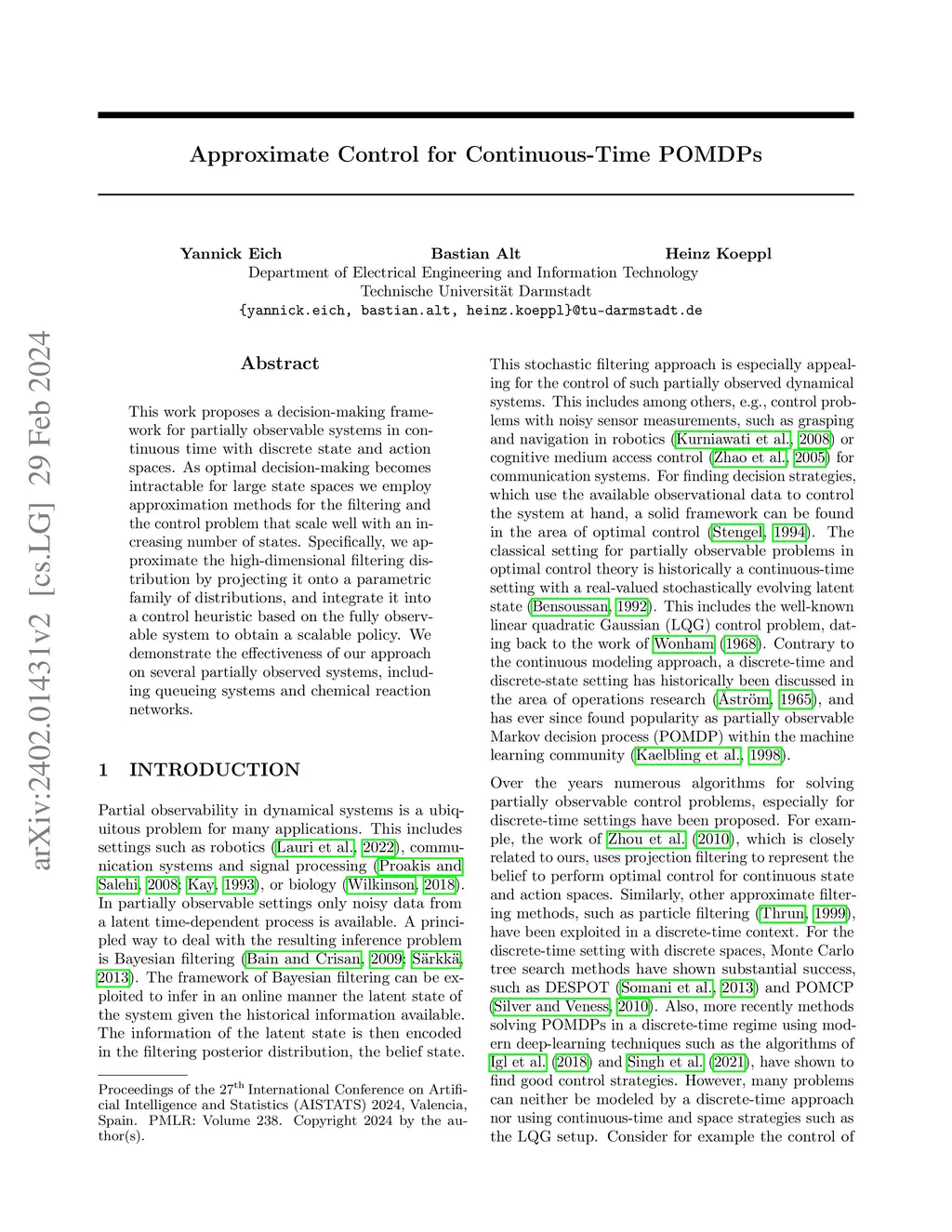 This work proposes a decision-making framework for partially observable systems in continuous time with discrete state and action spaces. As optimal decision-making becomes intractable for large state spaces we employ approximation methods for the filtering and the control problem that scale well with an increasing number of states. Specifically, we approximate the high-dimensional filtering distribution by projecting it onto a parametric family of distributions, and integrate it into a control heuristic based on the fully observable system to obtain a scalable policy. We demonstrate the effectiveness of our approach on several partially observed systems, including queueing systems and chemical reaction networks.