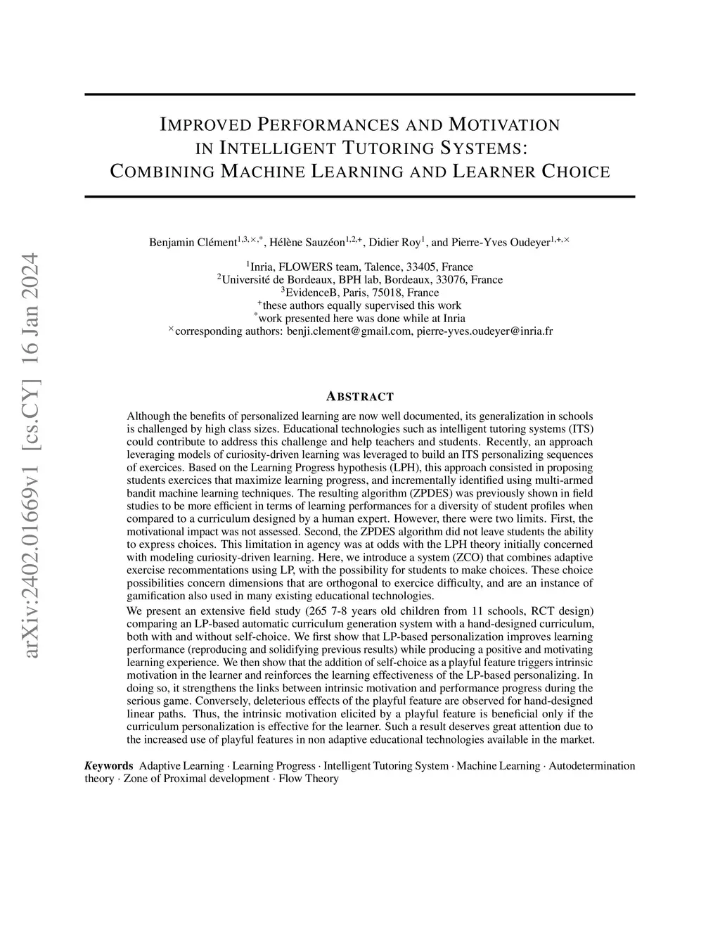 Improved Performances and Motivation in Intelligent Tutoring Systems: Combining Machine Learning and Learner Choice