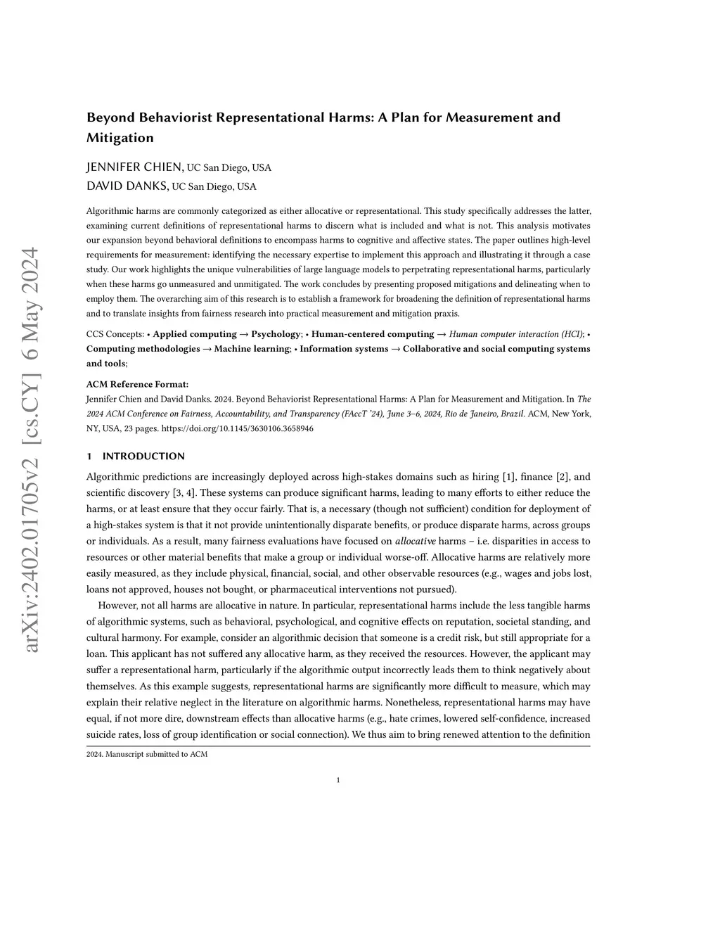 Algorithmic harms are commonly categorized as either allocative or representational. This study specifically addresses the latter, focusing on an examination of current definitions of representational harms to discern what is included and what is not. This analysis motivates our expansion beyond behavioral definitions to encompass harms to cognitive and affective states. The paper outlines high-level requirements for measurement: identifying the necessary expertise to implement this approach and illustrating it through a case study. Our work highlights the unique vulnerabilities of large language models to perpetrating representational harms, particularly when these harms go unmeasured and unmitigated. The work concludes by presenting proposed mitigations and delineating when to employ them. The overarching aim of this research is to establish a framework for broadening the definition of representational harms and to translate insights from fairness research into practical measurement and mitigation praxis.