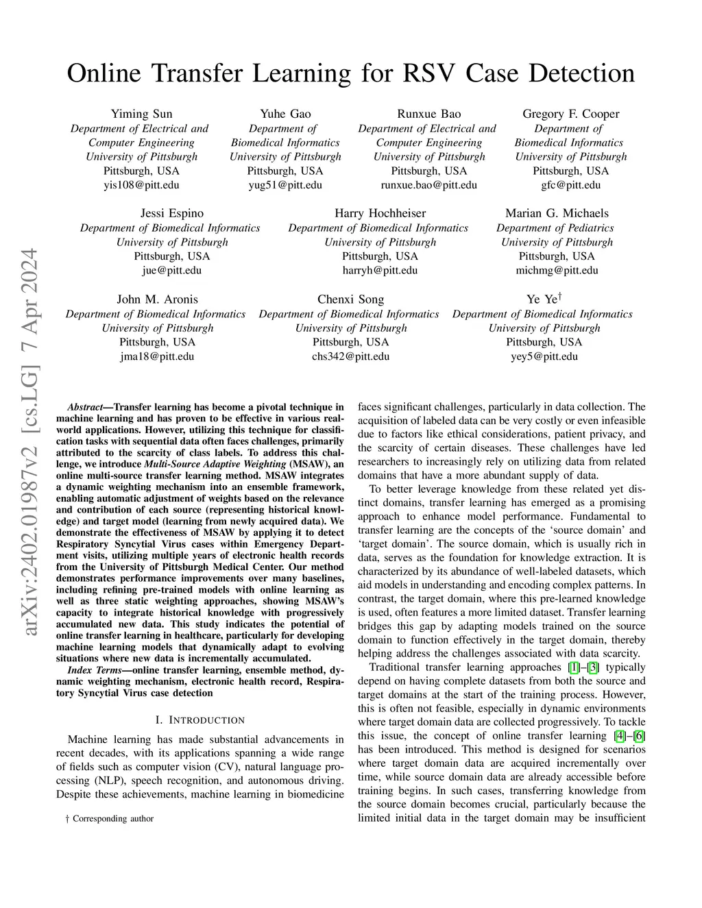 Transfer learning has become a pivotal technique in machine learning and has proven to be effective in various real-world applications. However, utilizing this technique for classification tasks with sequential data often faces challenges, primarily attributed to the scarcity of class labels. To address this challenge, we introduce Multi-Source Adaptive Weighting (MSAW), an online multi-source transfer learning method. MSAW integrates a dynamic weighting mechanism into an ensemble framework, enabling automatic adjustment of weights based on the relevance and contribution of each source (representing historical knowledge) and target model (learning from newly acquired data). We demonstrate the effectiveness of MSAW by applying it to detect Respiratory Syncytial Virus cases within Emergency Department visits, utilizing multiple years of electronic health records from the University of Pittsburgh Medical Center. Our method demonstrates performance improvements over many baselines, including refining pre-trained models with online learning as well as three static weighting approaches, showing MSAW's capacity to integrate historical knowledge with progressively accumulated new data. This study indicates the potential of online transfer learning in healthcare, particularly for developing machine learning models that dynamically adapt to evolving situations where new data is incrementally accumulated.