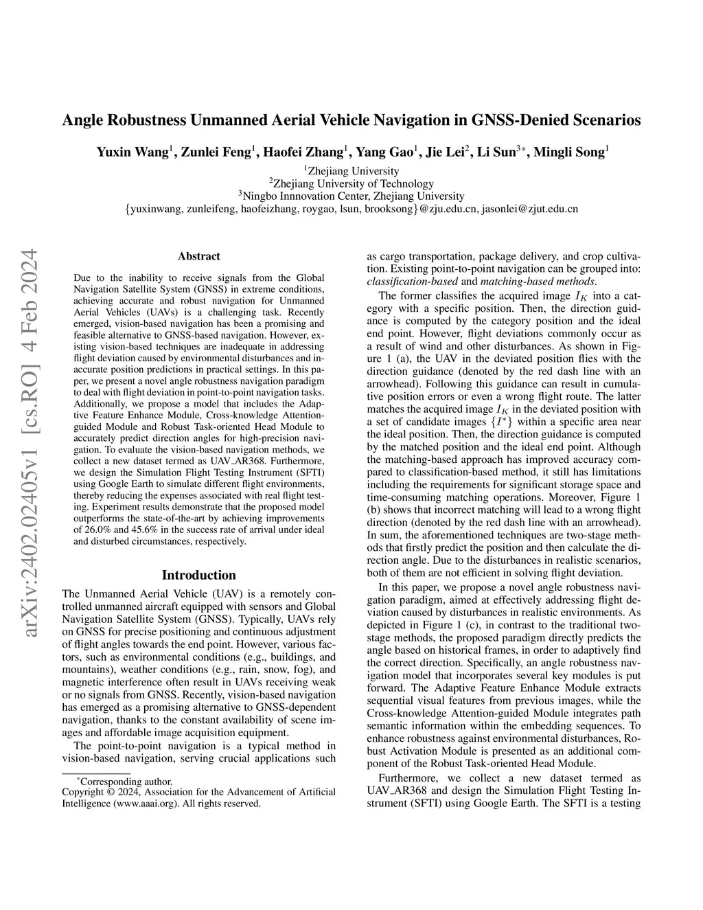 Due to the inability to receive signals from the Global Navigation Satellite System (GNSS) in extreme conditions, achieving accurate and robust navigation for Unmanned Aerial Vehicles (UAVs) is a challenging task. Recently emerged, vision-based navigation has been a promising and feasible alternative to GNSS-based navigation. However, existing vision-based techniques are inadequate in addressing flight deviation caused by environmental disturbances and inaccurate position predictions in practical settings. In this paper, we present a novel angle robustness navigation paradigm to deal with flight deviation in point-to-point navigation tasks. Additionally, we propose a model that includes the Adaptive Feature Enhance Module, Cross-knowledge Attention-guided Module and Robust Task-oriented Head Module to accurately predict direction angles for high-precision navigation. To evaluate the vision-based navigation methods, we collect a new dataset termed as UAV_AR368. Furthermore, we design the Simulation Flight Testing Instrument (SFTI) using Google Earth to simulate different flight environments, thereby reducing the expenses associated with real flight testing. Experiment results demonstrate that the proposed model outperforms the state-of-the-art by achieving improvements of 26.0% and 45.6% in the success rate of arrival under ideal and disturbed circumstances, respectively.