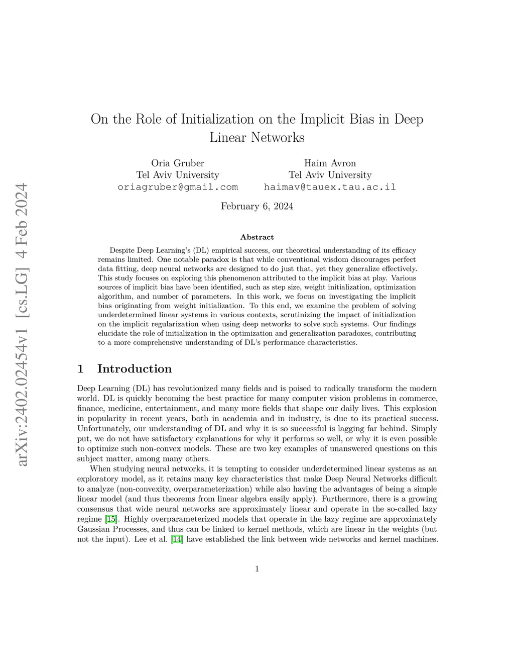 Despite Deep Learning's (DL) empirical success, our theoretical understanding of its efficacy remains limited. One notable paradox is that while conventional wisdom discourages perfect data fitting, deep neural networks are designed to do just that, yet they generalize effectively. This study focuses on exploring this phenomenon attributed to the implicit bias at play. Various sources of implicit bias have been identified, such as step size, weight initialization, optimization algorithm, and number of parameters. In this work, we focus on investigating the implicit bias originating from weight initialization. To this end, we examine the problem of solving underdetermined linear systems in various contexts, scrutinizing the impact of initialization on the implicit regularization when using deep networks to solve such systems. Our findings elucidate the role of initialization in the optimization and generalization paradoxes, contributing to a more comprehensive understanding of DL's performance characteristics.