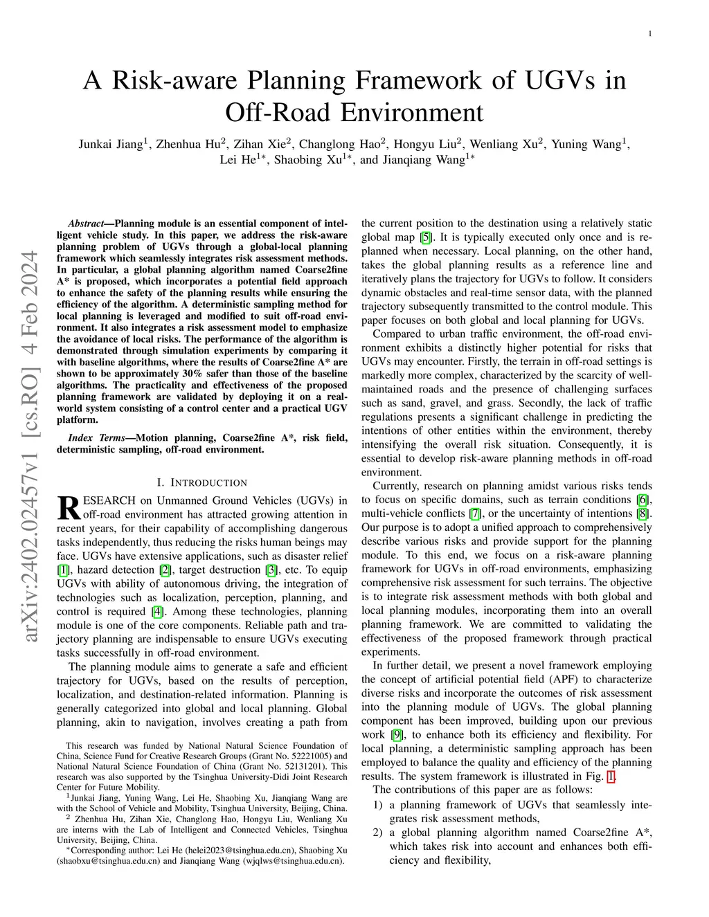 Planning module is an essential component of intelligent vehicle study. In this paper, we address the risk-aware planning problem of UGVs through a global-local planning framework which seamlessly integrates risk assessment methods. In particular, a global planning algorithm named Coarse2fine A* is proposed, which incorporates a potential field approach to enhance the safety of the planning results while ensuring the efficiency of the algorithm. A deterministic sampling method for local planning is leveraged and modified to suit off-road environment. It also integrates a risk assessment model to emphasize the avoidance of local risks. The performance of the algorithm is demonstrated through simulation experiments by comparing it with baseline algorithms, where the results of Coarse2fine A* are shown to be approximately 30% safer than those of the baseline algorithms. The practicality and effectiveness of the proposed planning framework are validated by deploying it on a real-world system consisting of a control center and a practical UGV platform.
