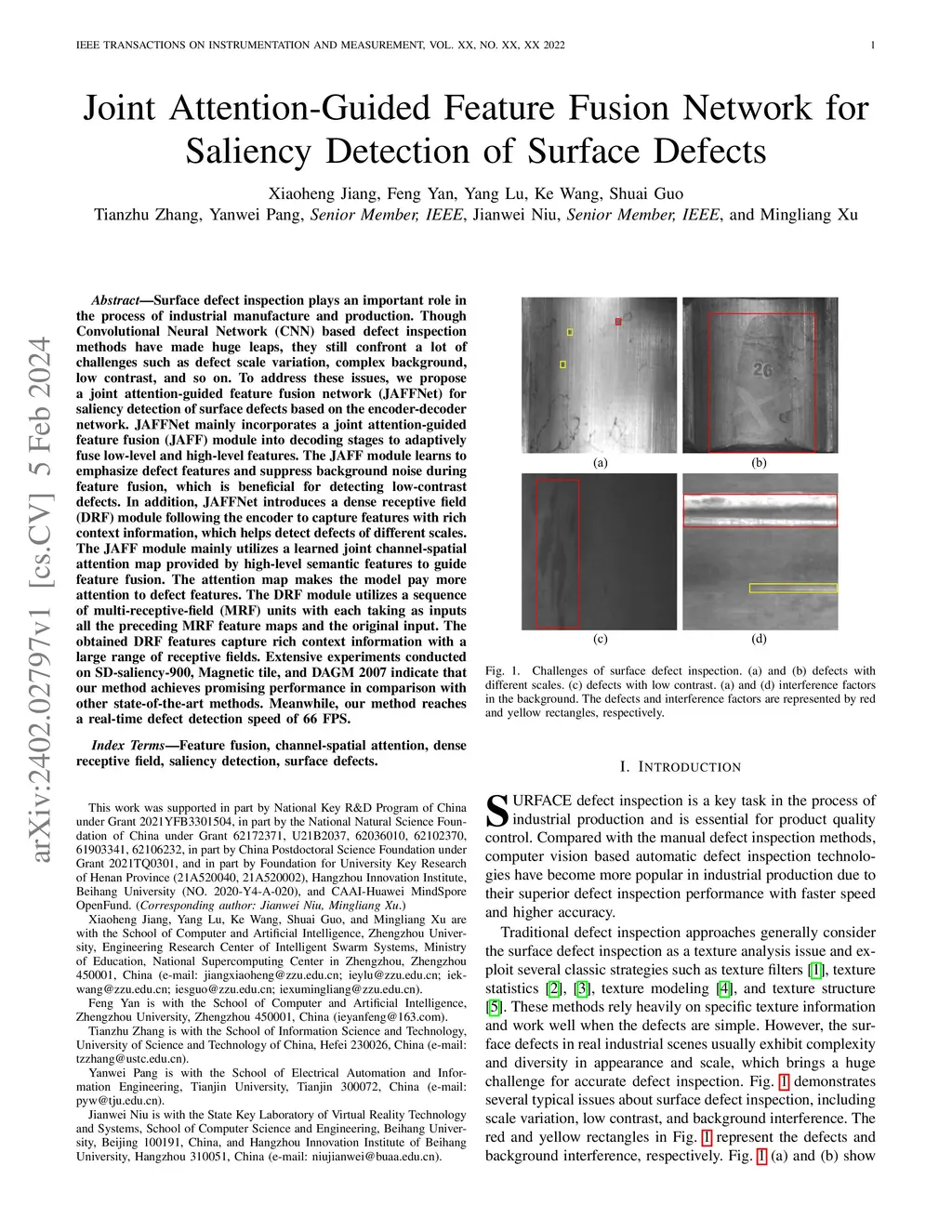 Surface defect inspection plays an important role in the process of industrial manufacture and production. Though Convolutional Neural Network (CNN) based defect inspection methods have made huge leaps, they still confront a lot of challenges such as defect scale variation, complex background, low contrast, and so on. To address these issues, we propose a joint attention-guided feature fusion network (JAFFNet) for saliency detection of surface defects based on the encoder-decoder network. JAFFNet mainly incorporates a joint attention-guided feature fusion (JAFF) module into decoding stages to adaptively fuse low-level and high-level features. The JAFF module learns to emphasize defect features and suppress background noise during feature fusion, which is beneficial for detecting low-contrast defects. In addition, JAFFNet introduces a dense receptive field (DRF) module following the encoder to capture features with rich context information, which helps detect defects of different scales. The JAFF module mainly utilizes a learned joint channel-spatial attention map provided by high-level semantic features to guide feature fusion. The attention map makes the model pay more attention to defect features. The DRF module utilizes a sequence of multi-receptive-field (MRF) units with each taking as inputs all the preceding MRF feature maps and the original input. The obtained DRF features capture rich context information with a large range of receptive fields. Extensive experiments conducted on SD-saliency-900, Magnetic tile, and DAGM 2007 indicate that our method achieves promising performance in comparison with other state-of-the-art methods. Meanwhile, our method reaches a real-time defect detection speed of 66 FPS.
