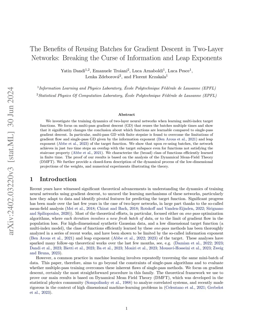 We investigate the training dynamics of two-layer neural networks when learning multi-index target functions. We focus on multi-pass gradient descent (GD) that reuses the batches multiple times and show that it significantly changes the conclusion about which functions are learnable compared to single-pass gradient descent. In particular, multi-pass GD with finite stepsize is found to overcome the limitations of gradient flow and single-pass GD given by the information exponent (Ben Arous et al., 2021) and leap exponent (Abbe et al., 2023) of the target function. We show that upon re-using batches, the network achieves in just two time steps an overlap with the target subspace even for functions not satisfying the staircase property (Abbe et al., 2021). We characterize the (broad) class of functions efficiently learned in finite time. The proof of our results is based on the analysis of the Dynamical Mean-Field Theory (DMFT). We further provide a closed-form description of the dynamical process of the low-dimensional projections of the weights, and numerical experiments illustrating the theory.