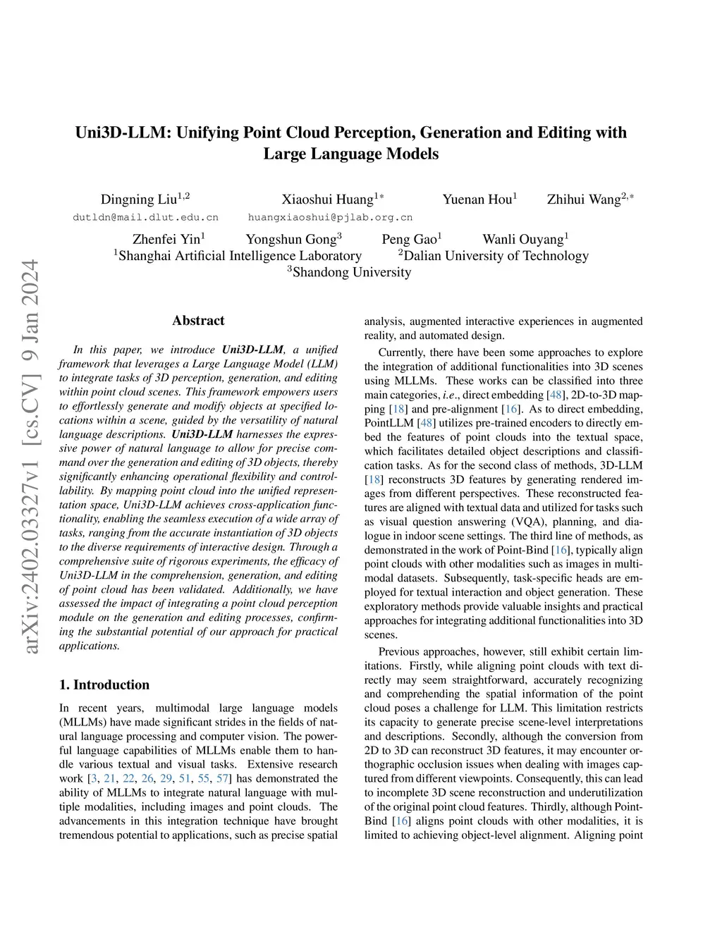 In this paper, we introduce Uni3D-LLM, a unified framework that leverages a Large Language Model (LLM) to integrate tasks of 3D perception, generation, and editing within point cloud scenes. This framework empowers users to effortlessly generate and modify objects at specified locations within a scene, guided by the versatility of natural language descriptions. Uni3D-LLM harnesses the expressive power of natural language to allow for precise command over the generation and editing of 3D objects, thereby significantly enhancing operational flexibility and controllability. By mapping point cloud into the unified representation space, Uni3D-LLM achieves cross-application functionality, enabling the seamless execution of a wide array of tasks, ranging from the accurate instantiation of 3D objects to the diverse requirements of interactive design. Through a comprehensive suite of rigorous experiments, the efficacy of Uni3D-LLM in the comprehension, generation, and editing of point cloud has been validated. Additionally, we have assessed the impact of integrating a point cloud perception module on the generation and editing processes, confirming the substantial potential of our approach for practical applications.