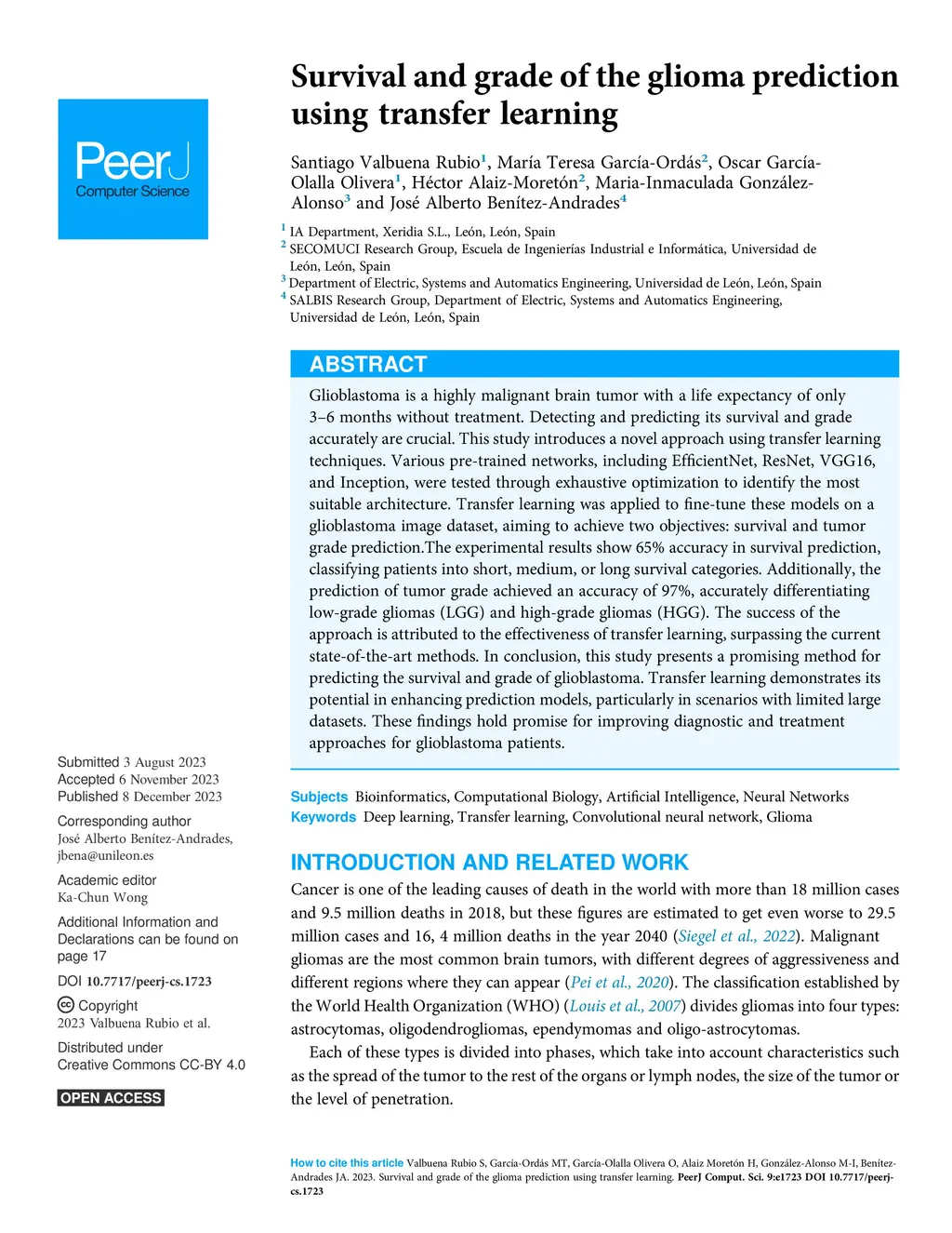 Glioblastoma is a highly malignant brain tumor with a life expectancy of only 3 to 6 months without treatment. Detecting and predicting its survival and grade accurately are crucial. This study introduces a novel approach using transfer learning techniques. Various pre-trained networks, including EfficientNet, ResNet, VGG16, and Inception, were tested through exhaustive optimization to identify the most suitable architecture. Transfer learning was applied to fine-tune these models on a glioblastoma image dataset, aiming to achieve two objectives: survival and tumor grade prediction.The experimental results show 65% accuracy in survival prediction, classifying patients into short, medium, or long survival categories. Additionally, the prediction of tumor grade achieved an accuracy of 97%, accurately differentiating low-grade gliomas (LGG) and high-grade gliomas (HGG). The success of the approach is attributed to the effectiveness of transfer learning, surpassing the current state-of-the-art methods. In conclusion, this study presents a promising method for predicting the survival and grade of glioblastoma. Transfer learning demonstrates its potential in enhancing prediction models, particularly in scenarios with limited large datasets. These findings hold promise for improving diagnostic and treatment approaches for glioblastoma patients.
