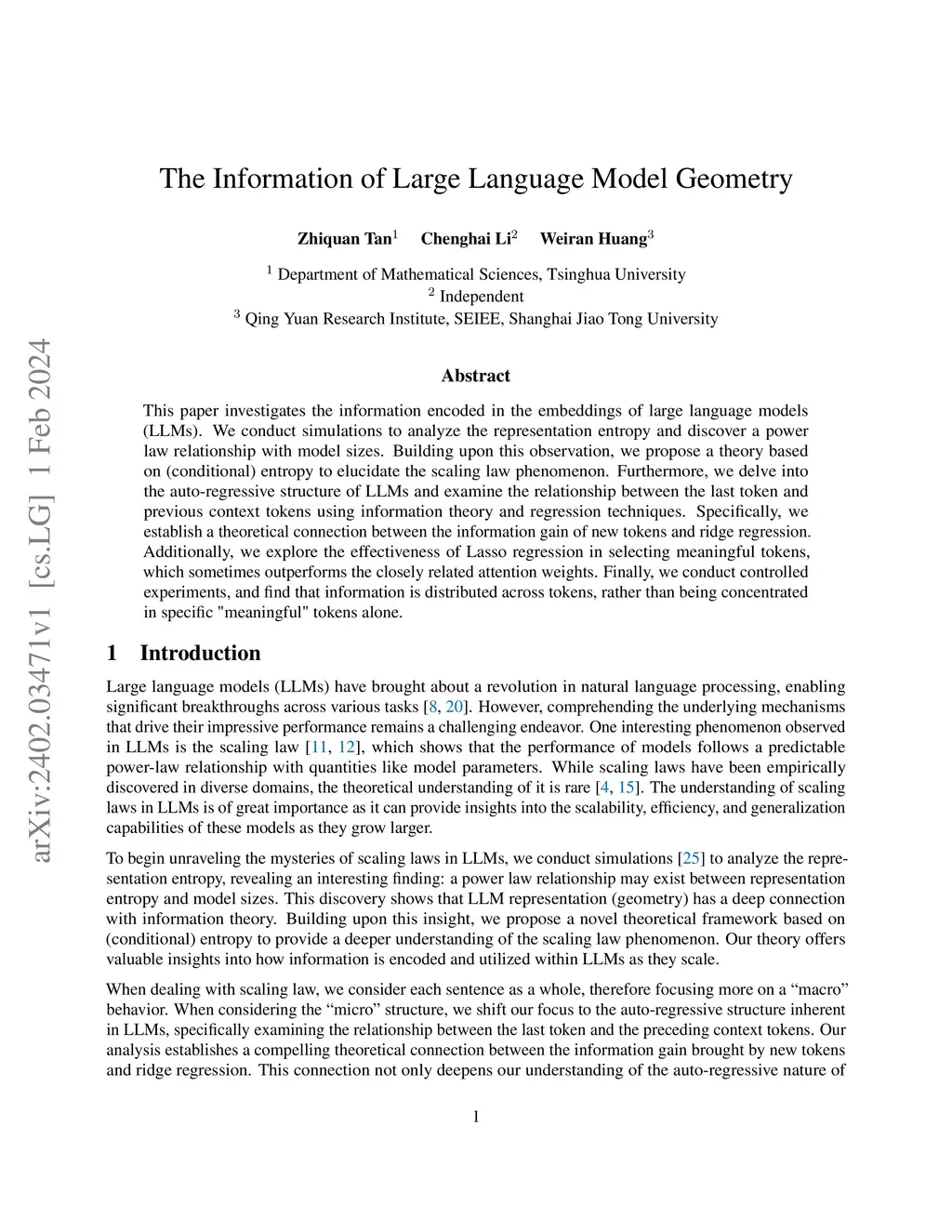 This paper investigates the information encoded in the embeddings of large language models (LLMs). We conduct simulations to analyze the representation entropy and discover a power law relationship with model sizes. Building upon this observation, we propose a theory based on (conditional) entropy to elucidate the scaling law phenomenon. Furthermore, we delve into the auto-regressive structure of LLMs and examine the relationship between the last token and previous context tokens using information theory and regression techniques. Specifically, we establish a theoretical connection between the information gain of new tokens and ridge regression. Additionally, we explore the effectiveness of Lasso regression in selecting meaningful tokens, which sometimes outperforms the closely related attention weights. Finally, we conduct controlled experiments, and find that information is distributed across tokens, rather than being concentrated in specific "meaningful" tokens alone.