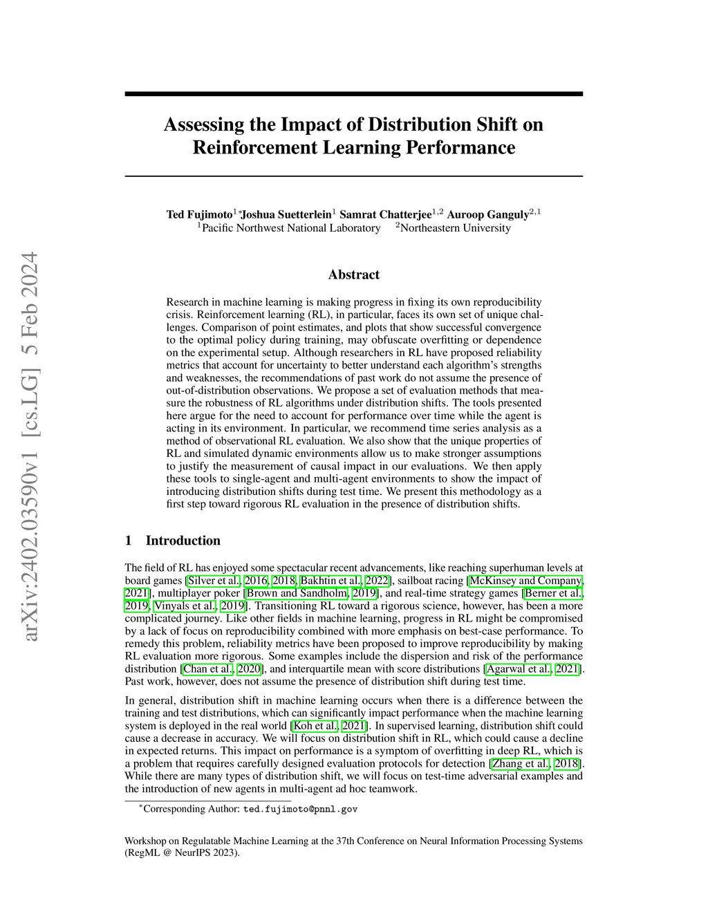 Research in machine learning is making progress in fixing its own reproducibility crisis. Reinforcement learning (RL), in particular, faces its own set of unique challenges. Comparison of point estimates, and plots that show successful convergence to the optimal policy during training, may obfuscate overfitting or dependence on the experimental setup. Although researchers in RL have proposed reliability metrics that account for uncertainty to better understand each algorithm's strengths and weaknesses, the recommendations of past work do not assume the presence of out-of-distribution observations. We propose a set of evaluation methods that measure the robustness of RL algorithms under distribution shifts. The tools presented here argue for the need to account for performance over time while the agent is acting in its environment. In particular, we recommend time series analysis as a method of observational RL evaluation. We also show that the unique properties of RL and simulated dynamic environments allow us to make stronger assumptions to justify the measurement of causal impact in our evaluations. We then apply these tools to single-agent and multi-agent environments to show the impact of introducing distribution shifts during test time. We present this methodology as a first step toward rigorous RL evaluation in the presence of distribution shifts.