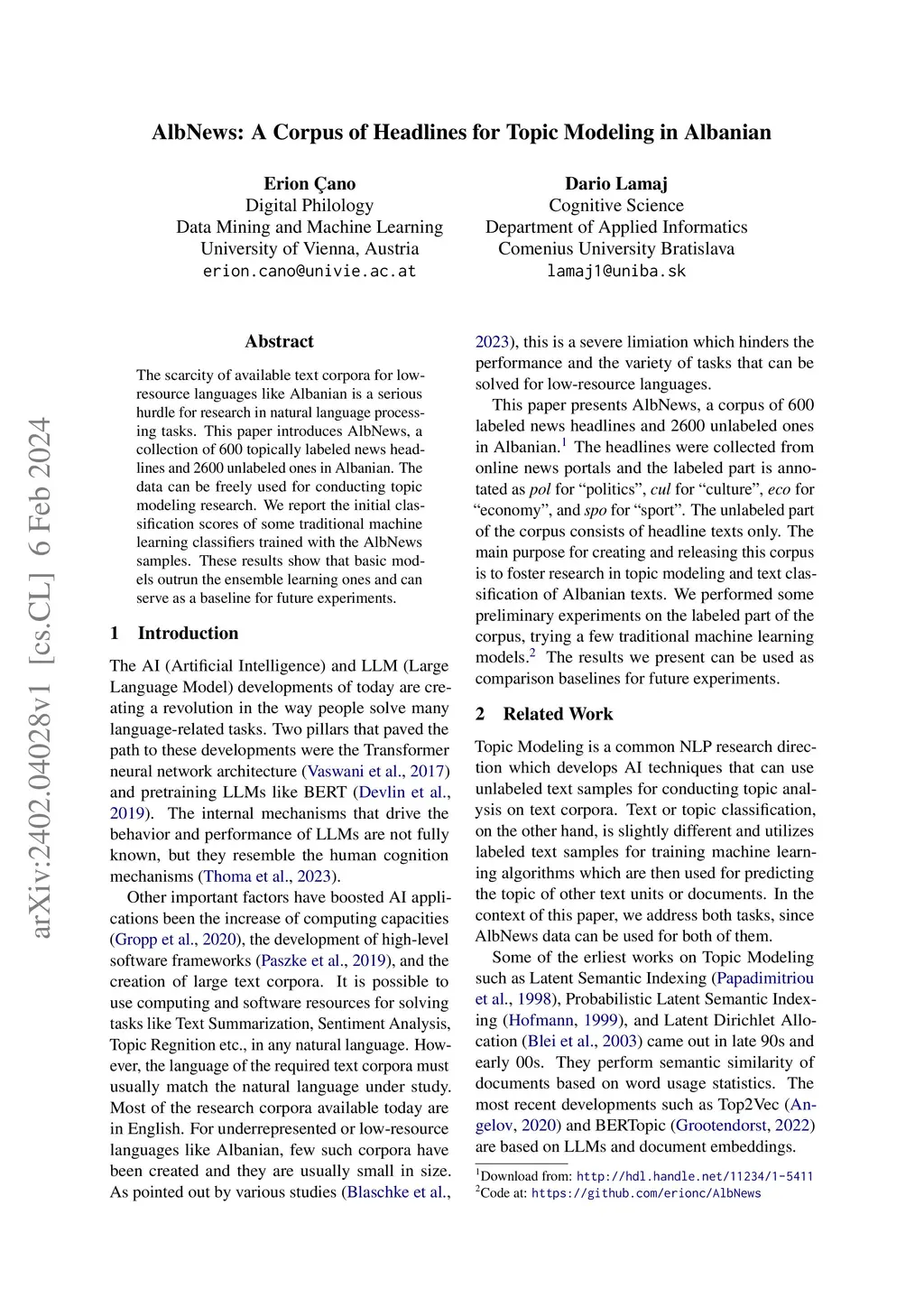AlbNews: A Corpus of Headlines for Topic Modeling in Albanian